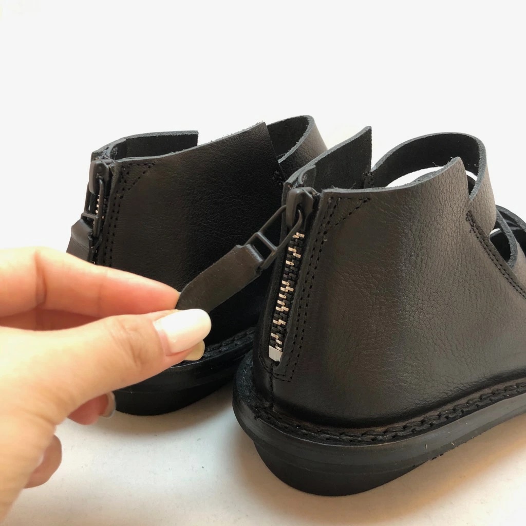 うしろジッパーのグラディエーターシューズ。
