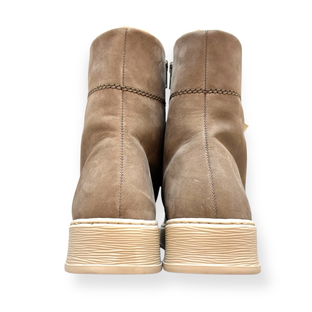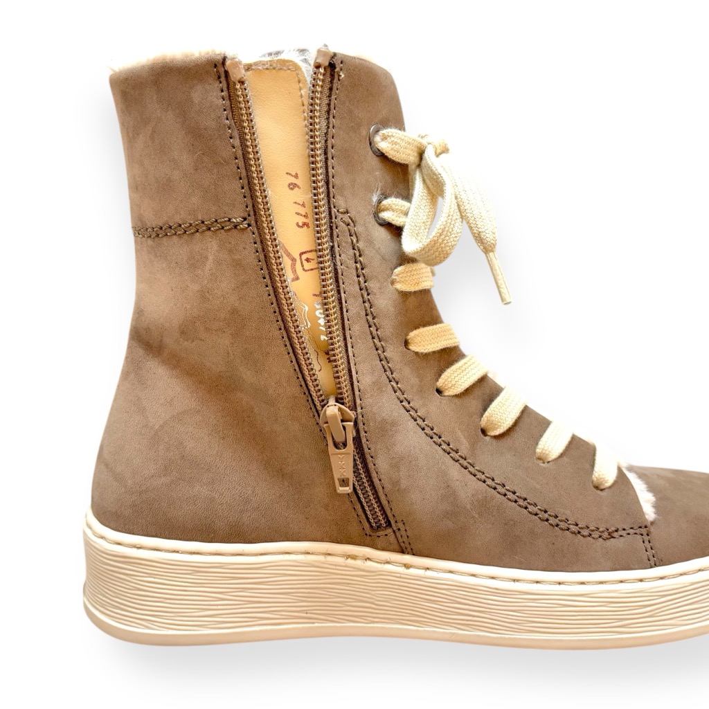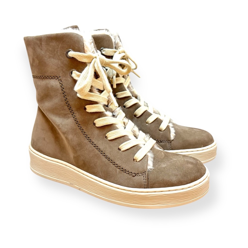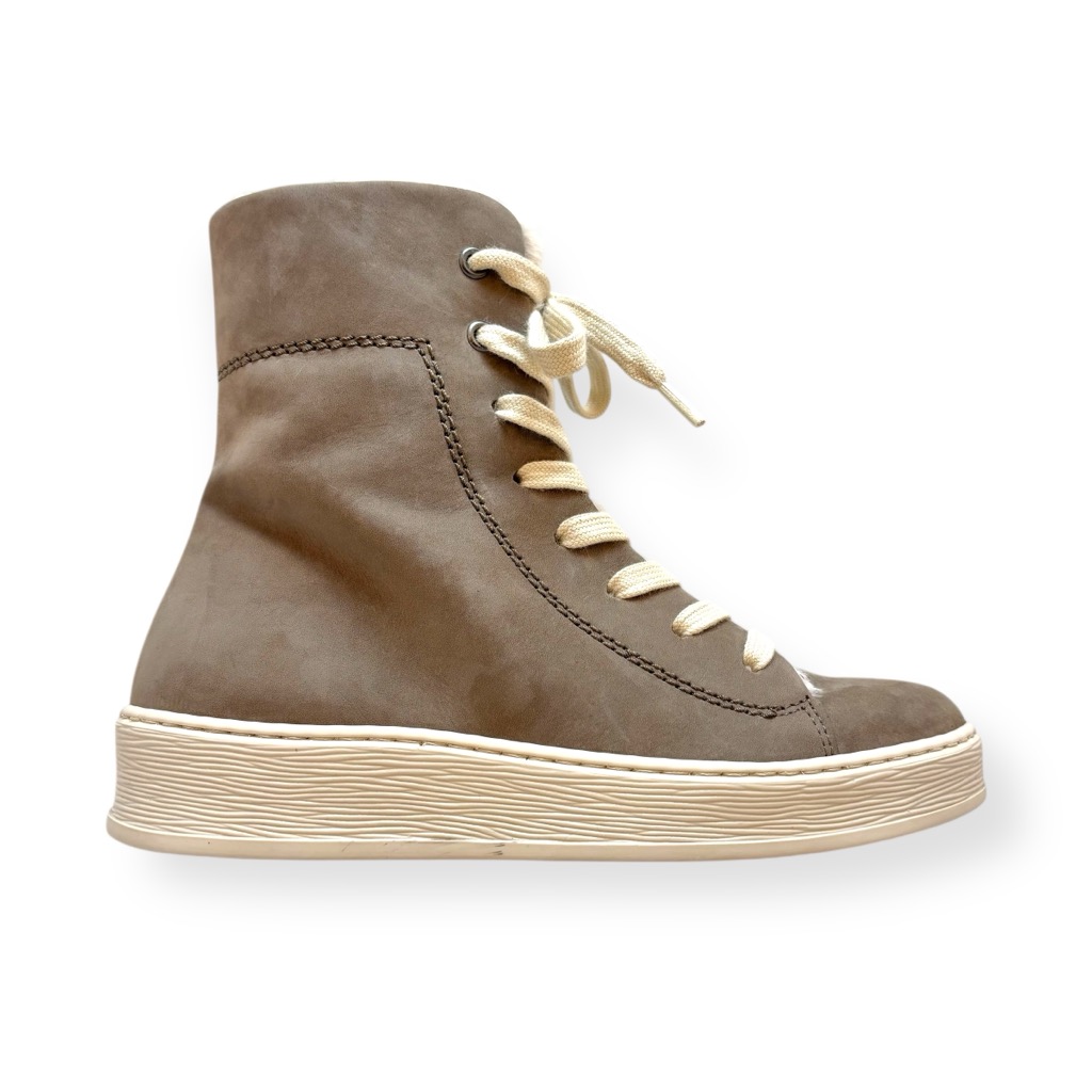 内ボアになったハイカットスニーカー。アッパーは柔らかく足馴染みの良い本革ヌバックを使用。履き口とシュータン裏についたウールのファーが可愛く印象的。内側ファスナーで脱ぎ履き簡単。インソールはカップインソールでしっかりとしたクッションがありとても履きやすいです。取り外しもできるためお好みのインソールと取り換えも可能です。寒い季節の屋外の行事などにも適した一足。カジュアルからきれい目まで色々な装いに映える使いやすい一足です。