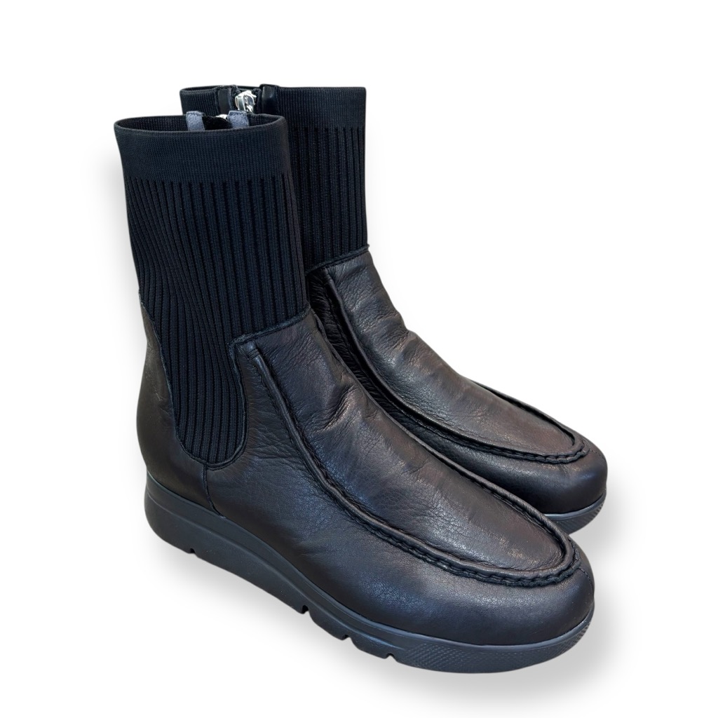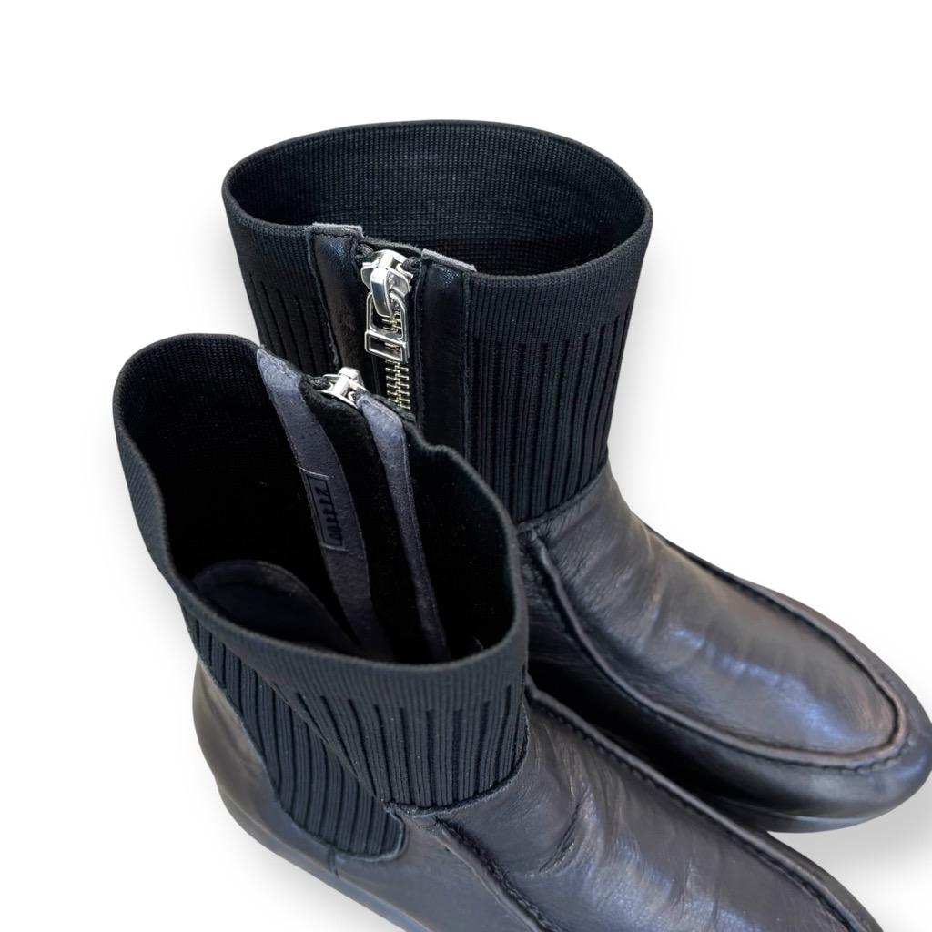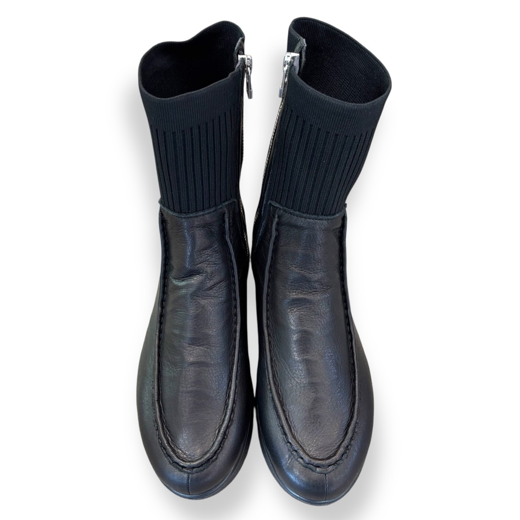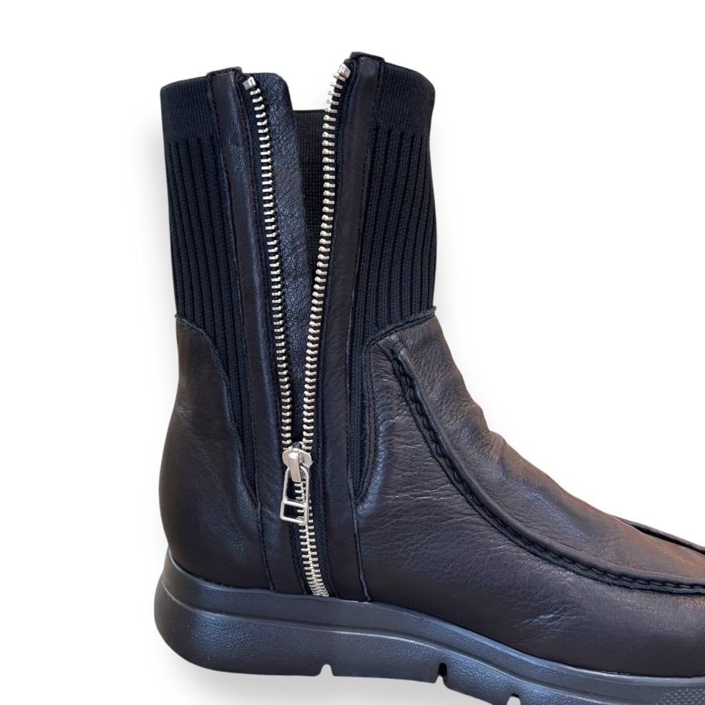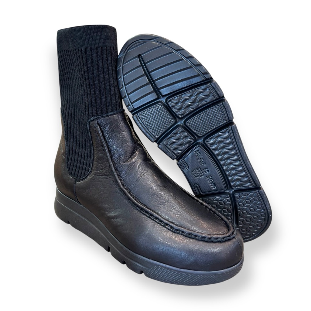 内側ファスナーになったショートブーツ。アッパーは非常に柔らかく足馴染みの良い牛革を使用。インソールはクッション入りのカップインソール。やや厚底になったソールは軽量で地面からの衝撃を吸収します。ジッパー付きで脱ぎ履き簡単。リブニットがアクセントになり色々なコーデをお楽しみいただけます。