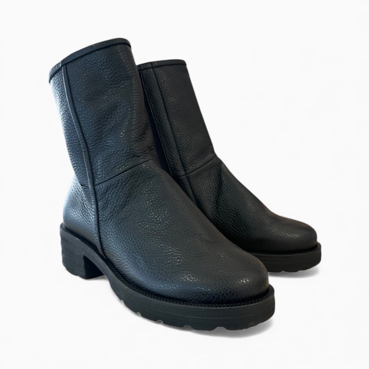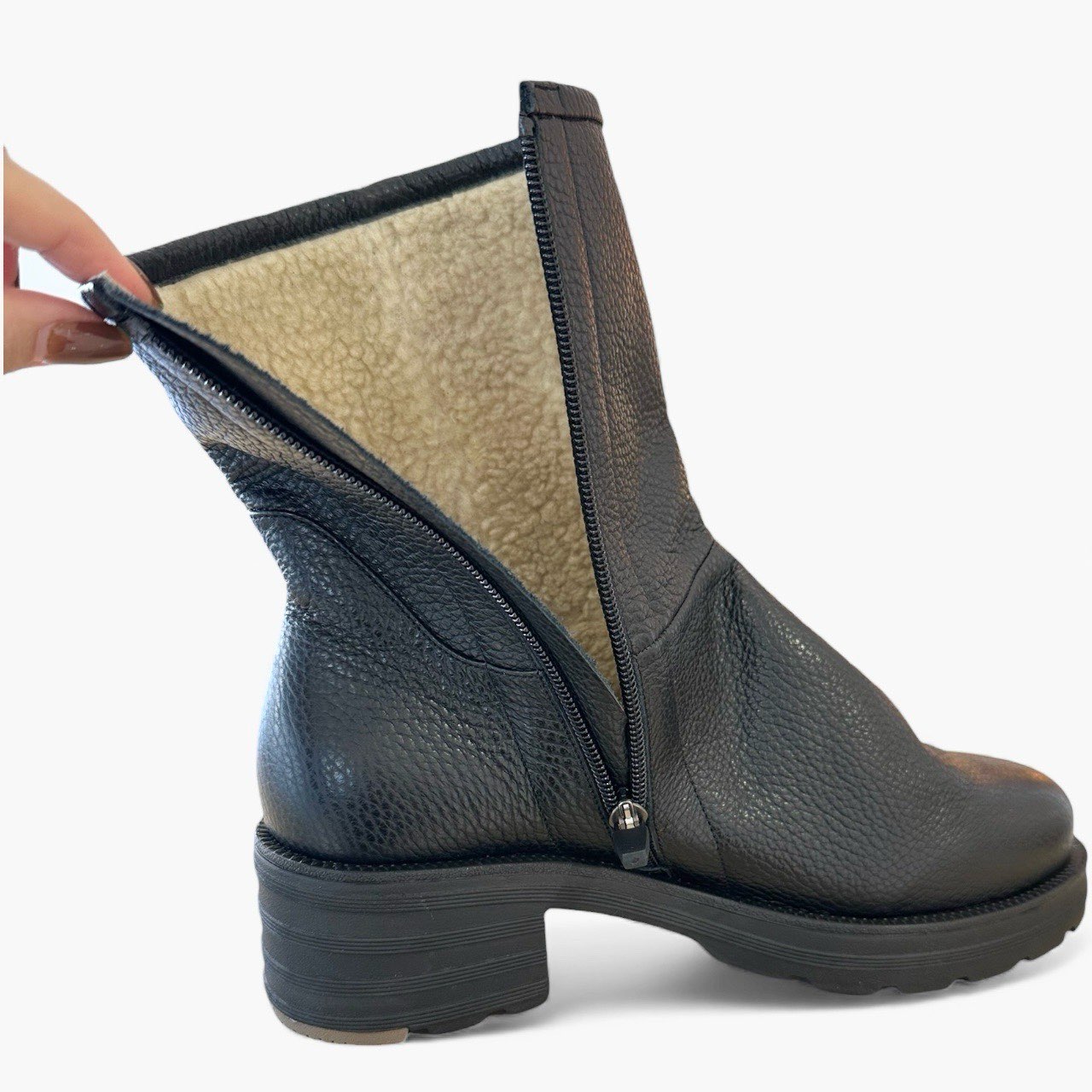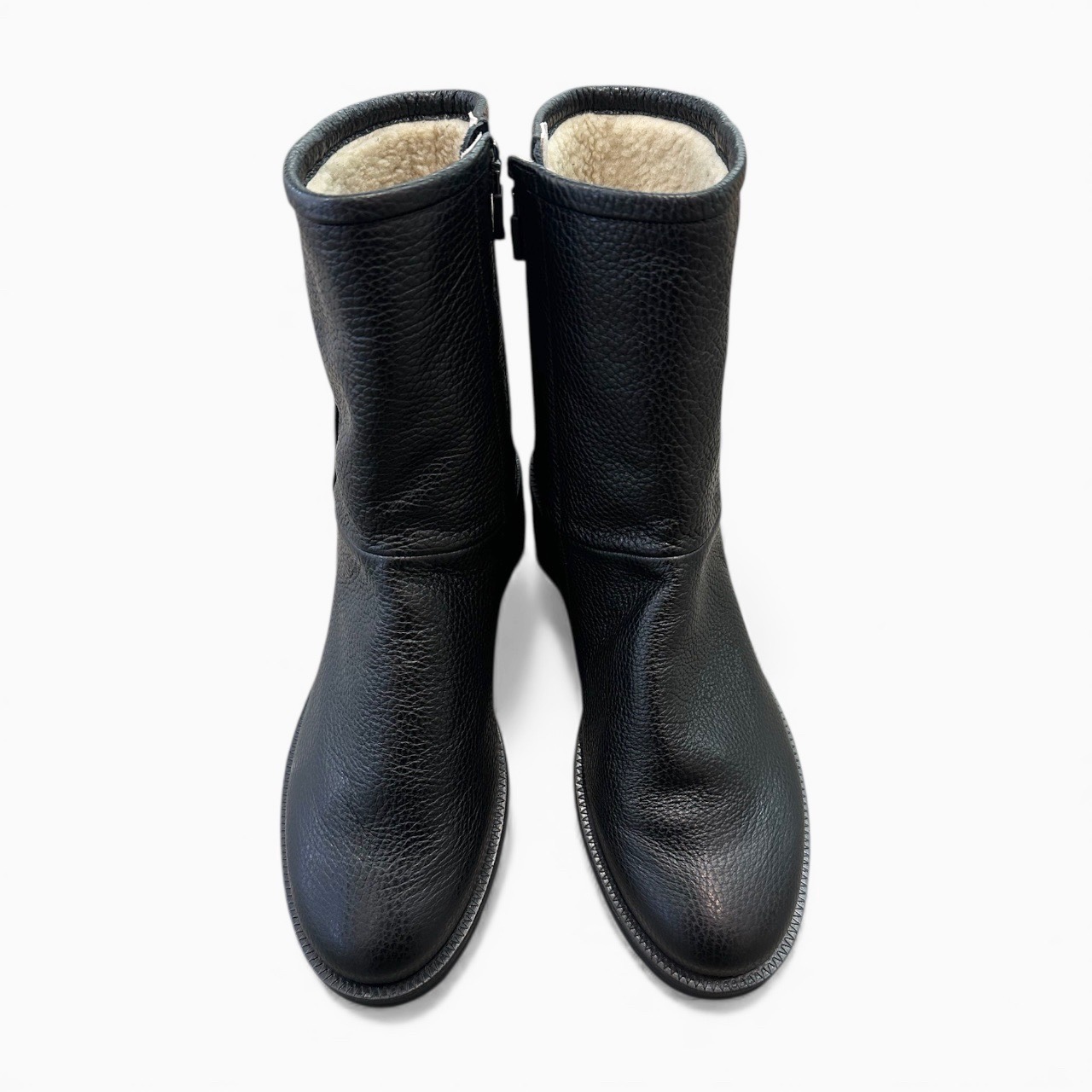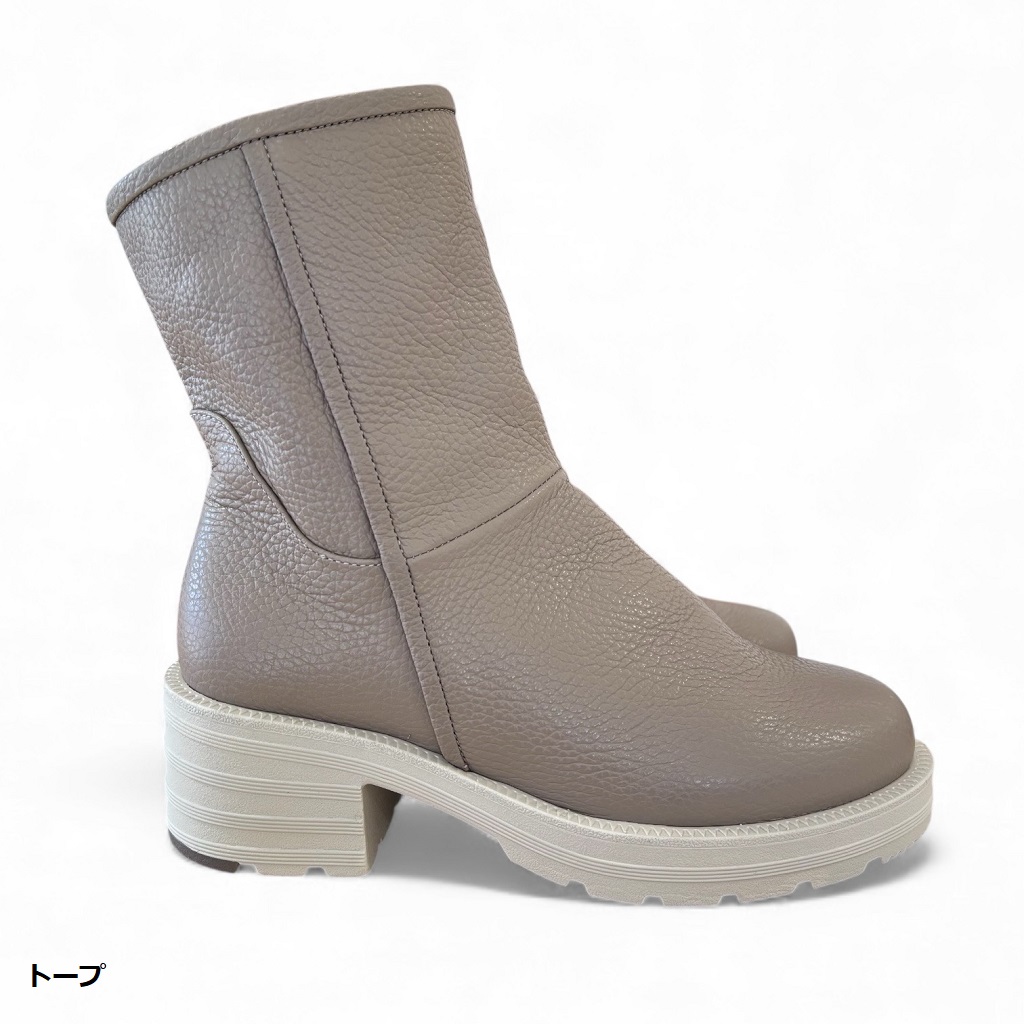 内側ファスナーになったボアインのショートブーツ。アッパーは全体にシボのある非常に柔らかく足馴染みの良い牛革を使用。インソールもボア付きのカップインソール。一体成型のやや厚底になったアウトソールは軽量で地面からの衝撃を吸収します。前部に25mmの厚みを持たせ自然にスタイルアップ。ジッパー付きで脱ぎ履き簡単。寒い季節も快適におしゃれコーデを楽しんでいただけます。