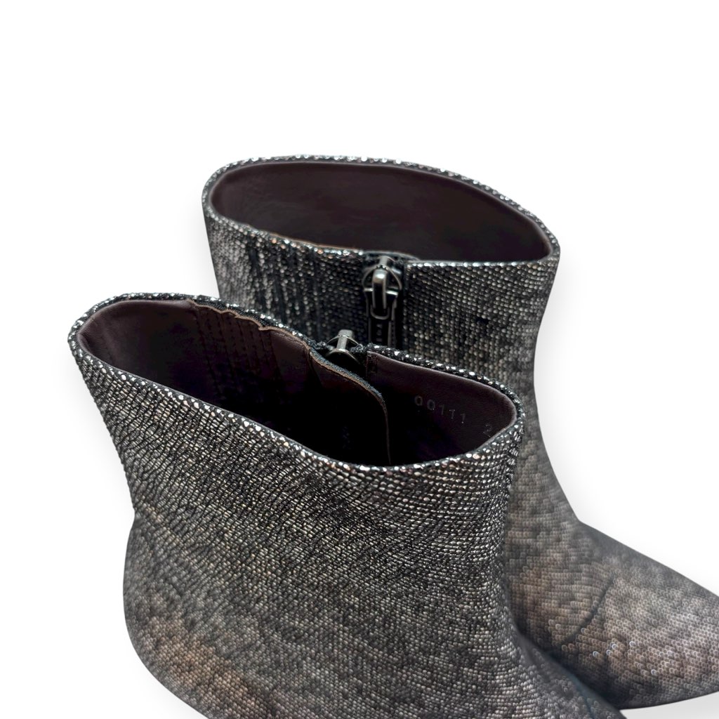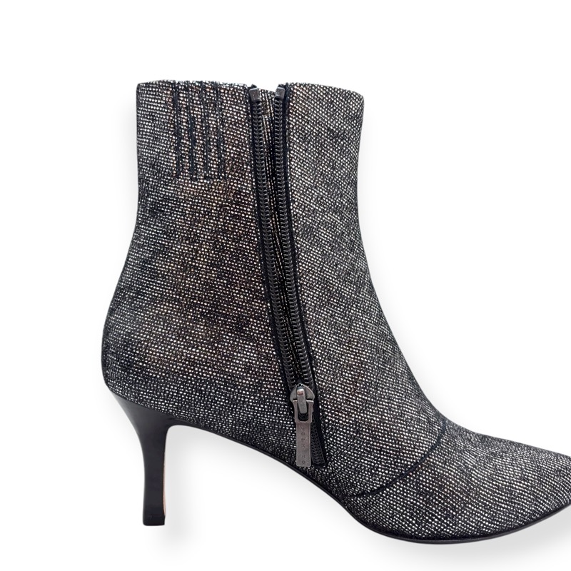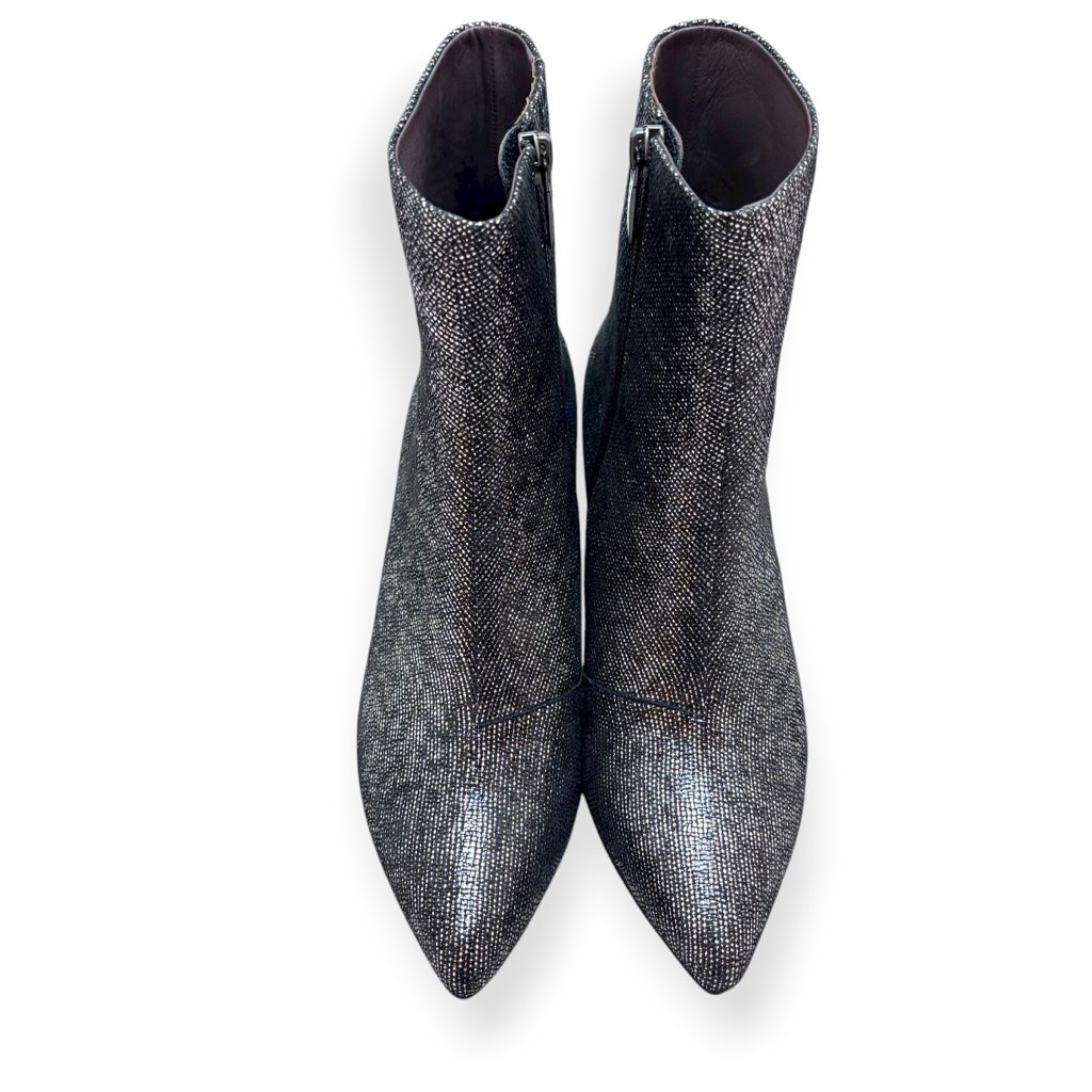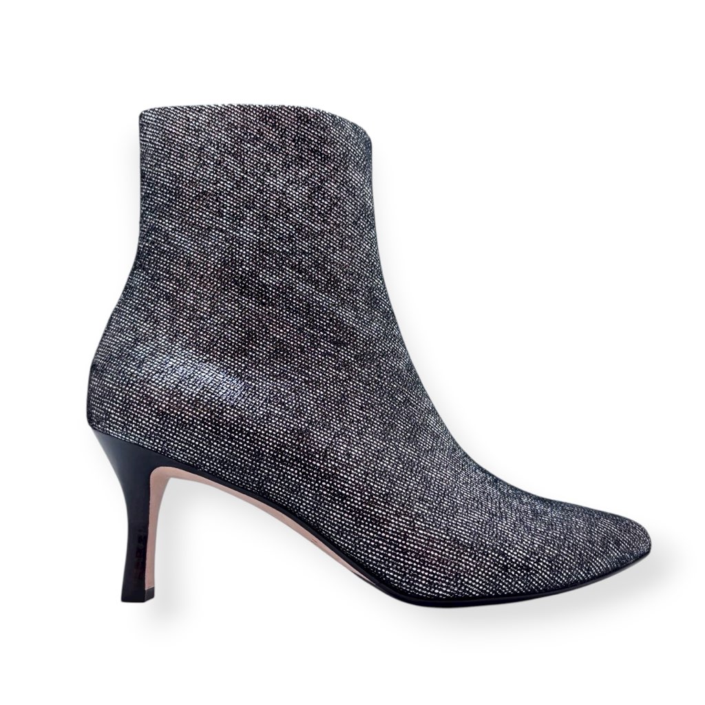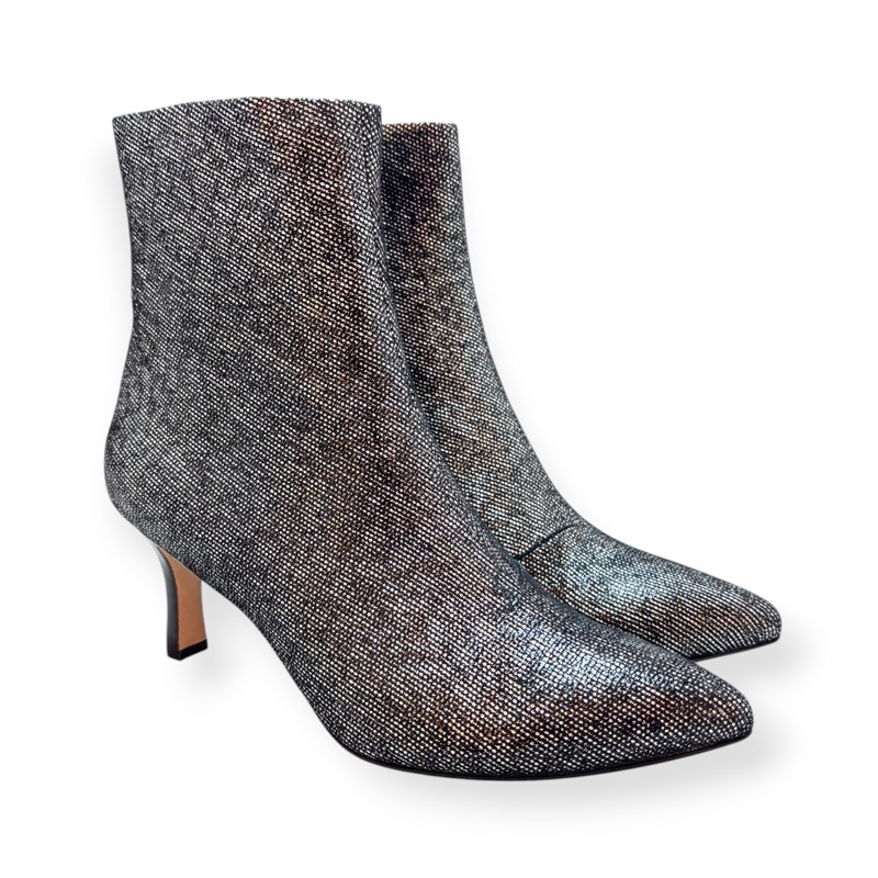 内側ファスナーのショートブーツ。アッパーは非常に柔らかい箔加工した本革カーフシルキーを使用。初めから足当たりが良く染みも抜群に良いです。インソールにはクッション入り。アウトソールは革底へ前部にラバーを張り付けた仕様。細めのヒールですが安定感がよく履きやすいです。内側ファスナーで脱ぎ履きも簡単。シャープなポインテッドトゥは足をきれいに見せてくれます。足を入れていただくと何よりその履き心地に感動です。