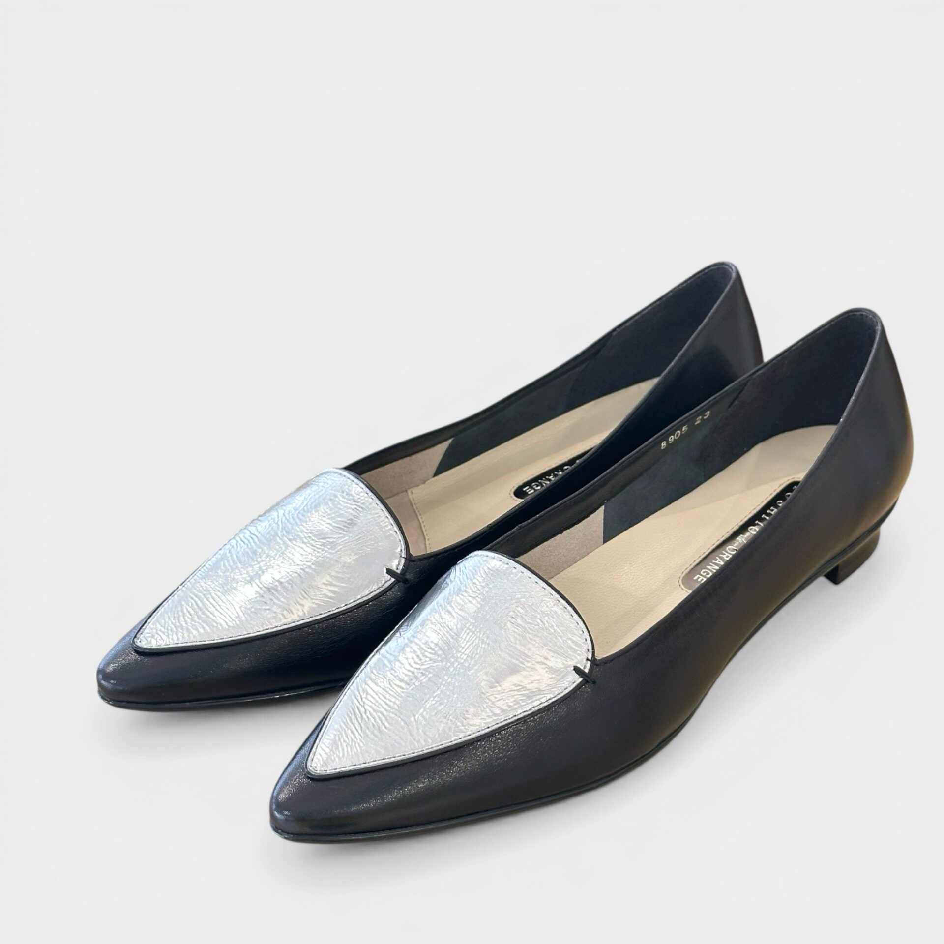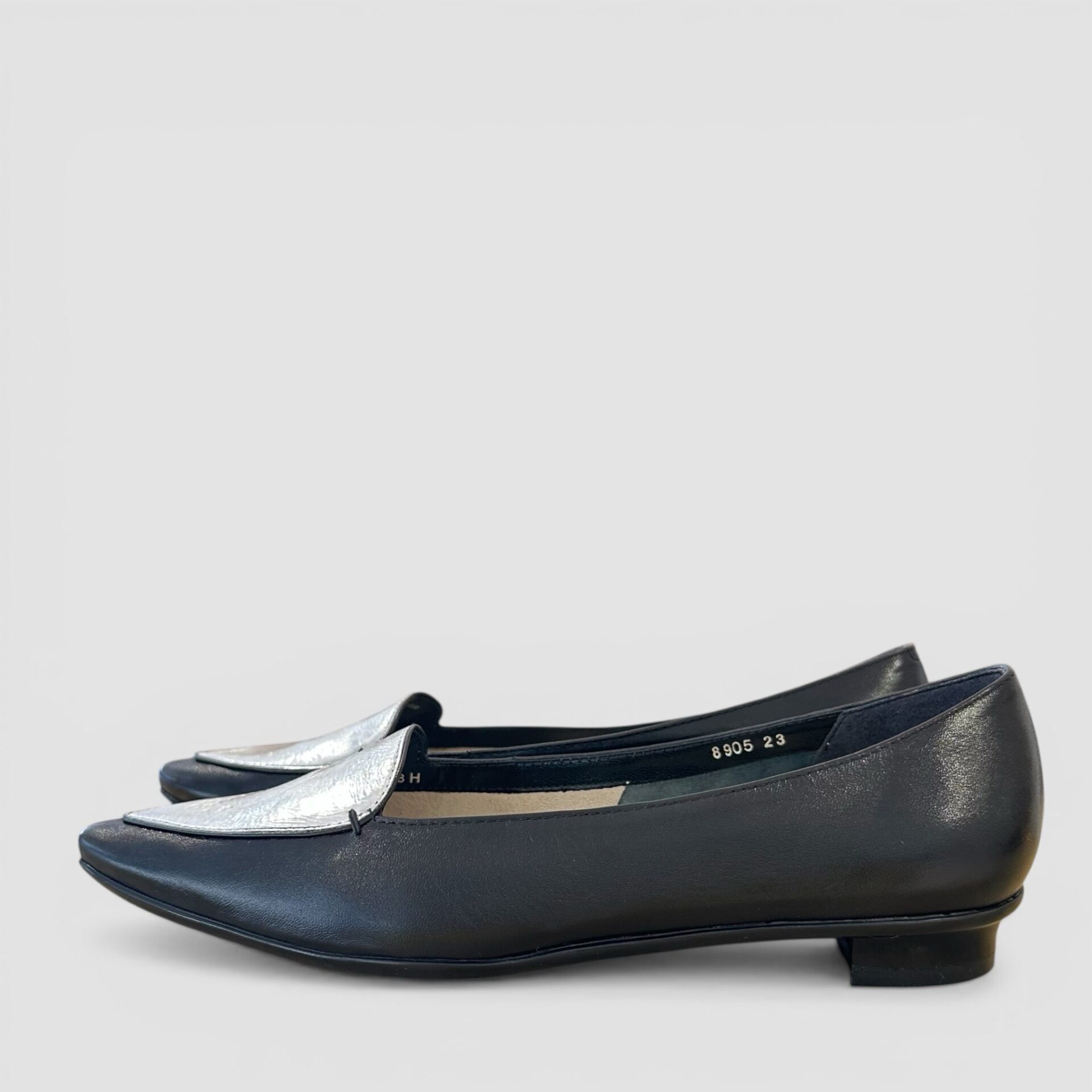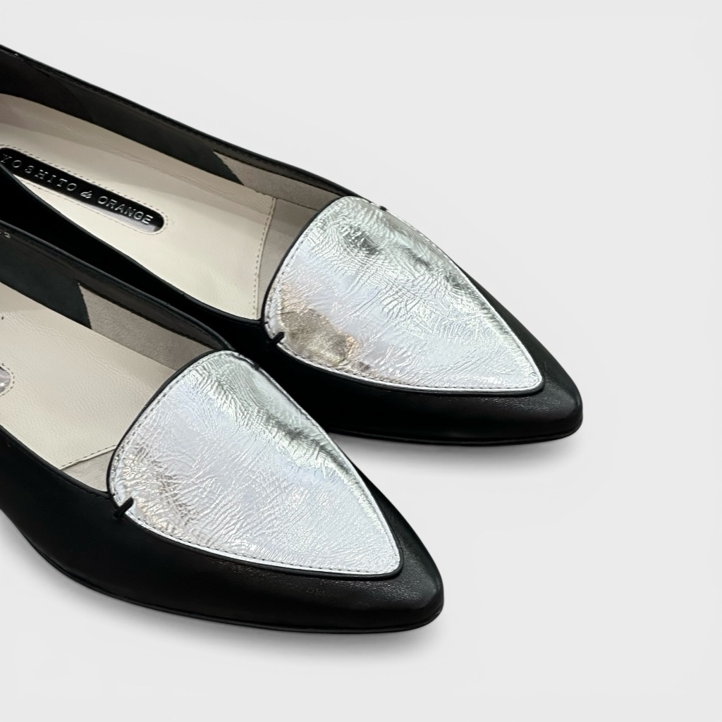 上品なコンビカラーのローヒールパンプス。アッパーはきめが細かく柔らかい本革を使用。足当たり・足馴染み共に非常に良いです。インソールにはクッション入り。サッと履けますが底の返りが良く安心のホールド感です。アウトソールはグリップのよく効くモールドソール。長歩きでも快適な履き心地。きちんと感があり品の良いデザインですがデイリーにカジュアル使いもできる登場機会の多い一足です。