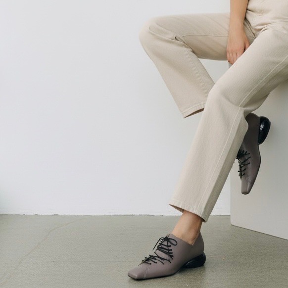 マニッシュでモードな雰囲気の表情とクセのある樽型ヒールがグッド。