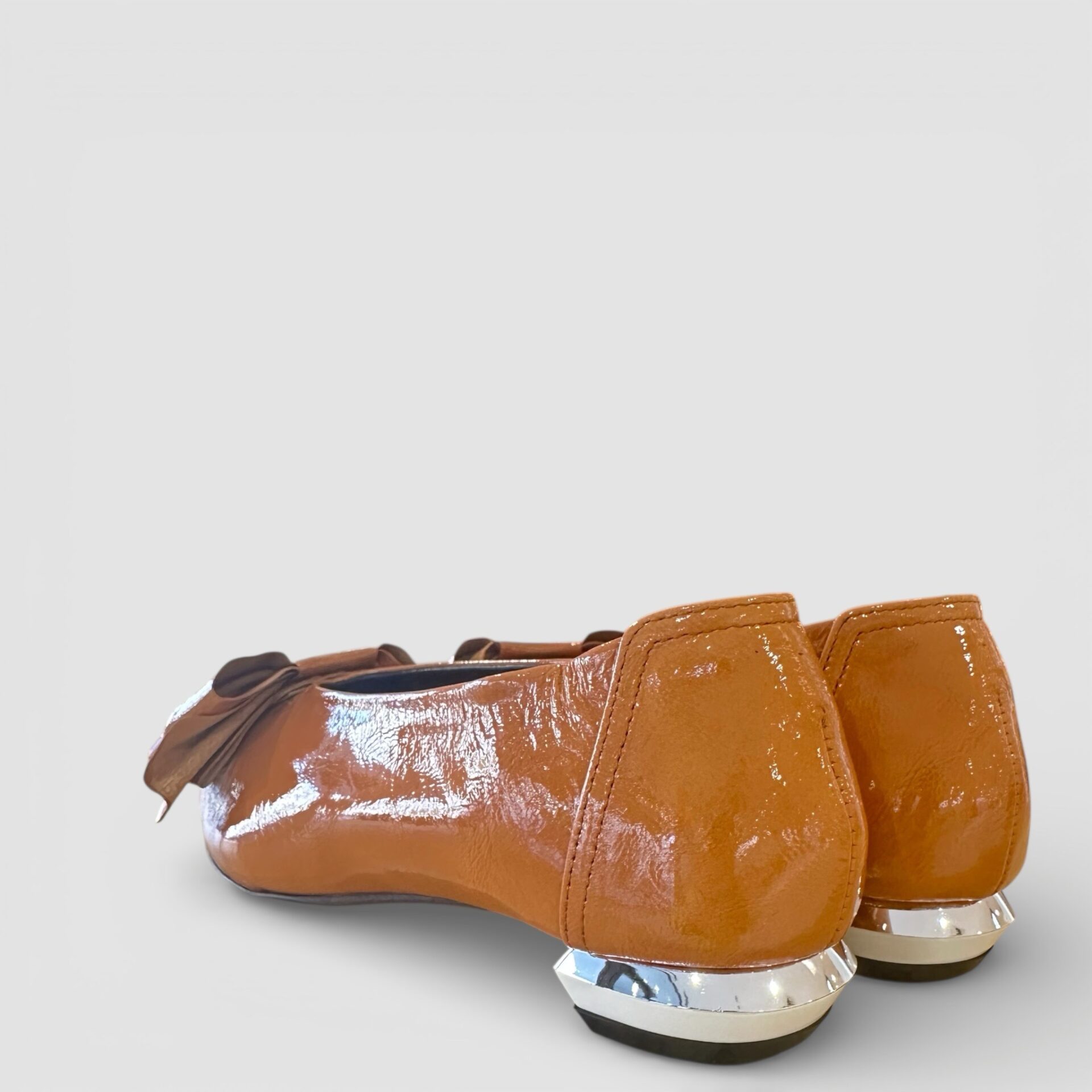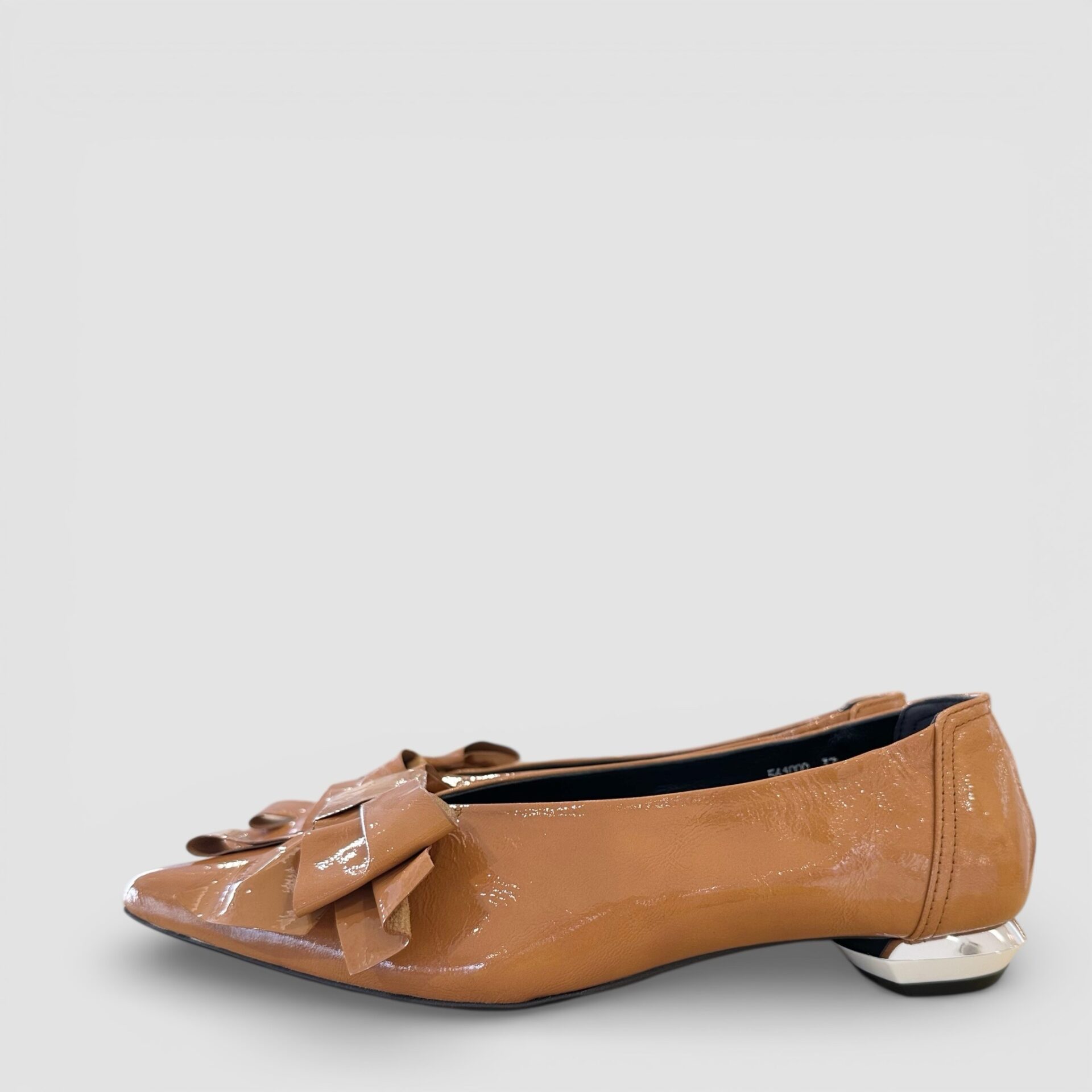 ポインテッドトゥとビッグリボンで甘辛テイストのカッターシューズ。アッパーはパテント加工した柔らかく足馴染みの良い本革を使用。サッと履けてホールド感も良く着脱ストレスがありません。インソールにはしっかりとしたクッションを搭載。母指球を包み込み外反母趾の方でも安心の足入れ。ローヒールでガシガシ歩ける快適な履き心地です。ボディと同色のビッグリボンは程よいアクセントの自然な印象で使いやすいシューズです。
