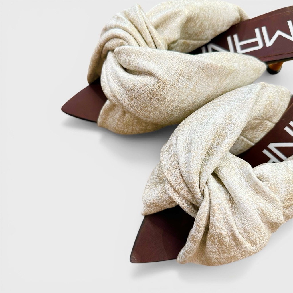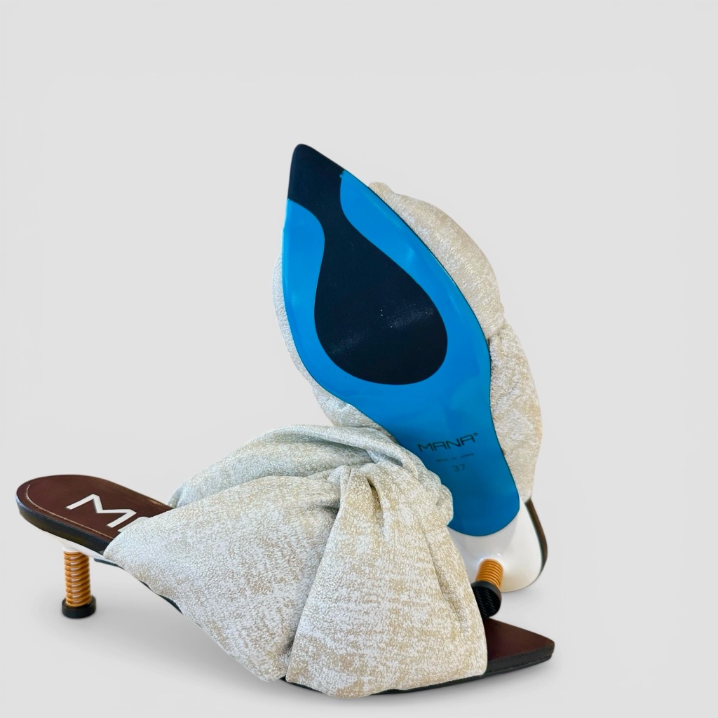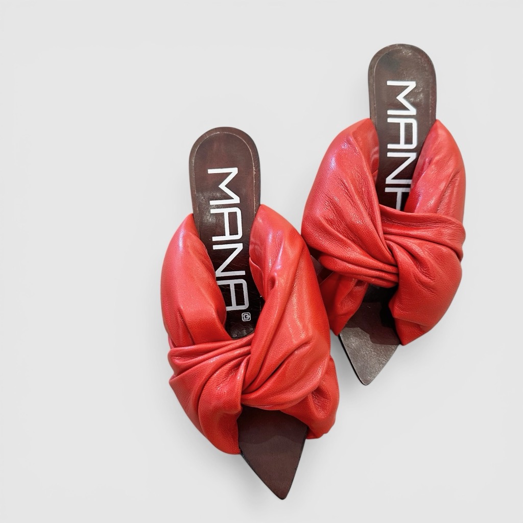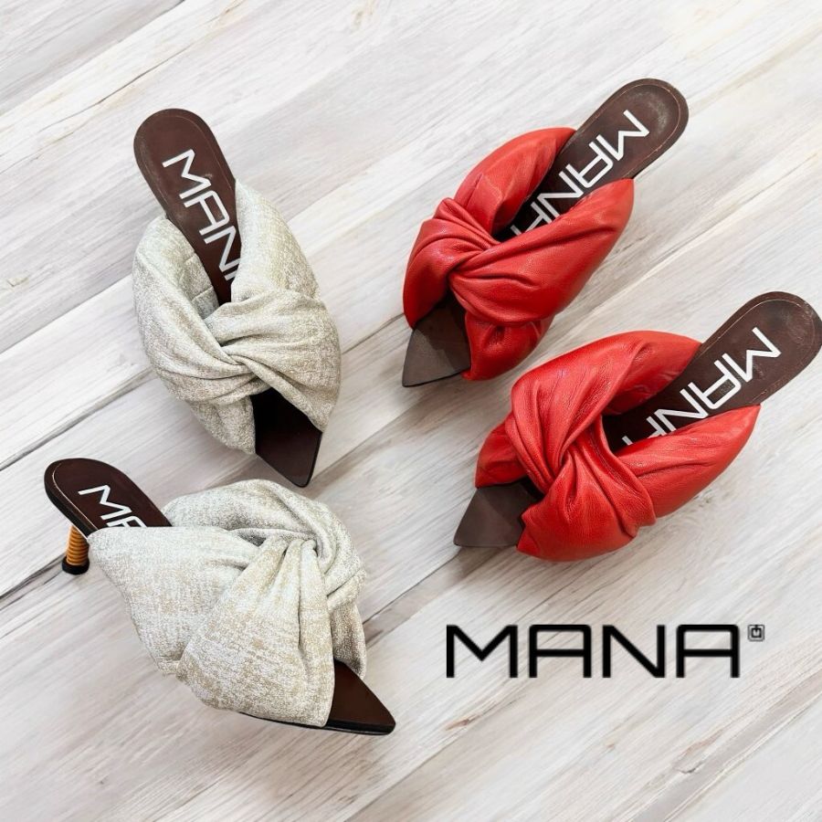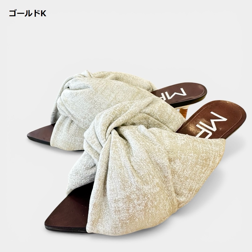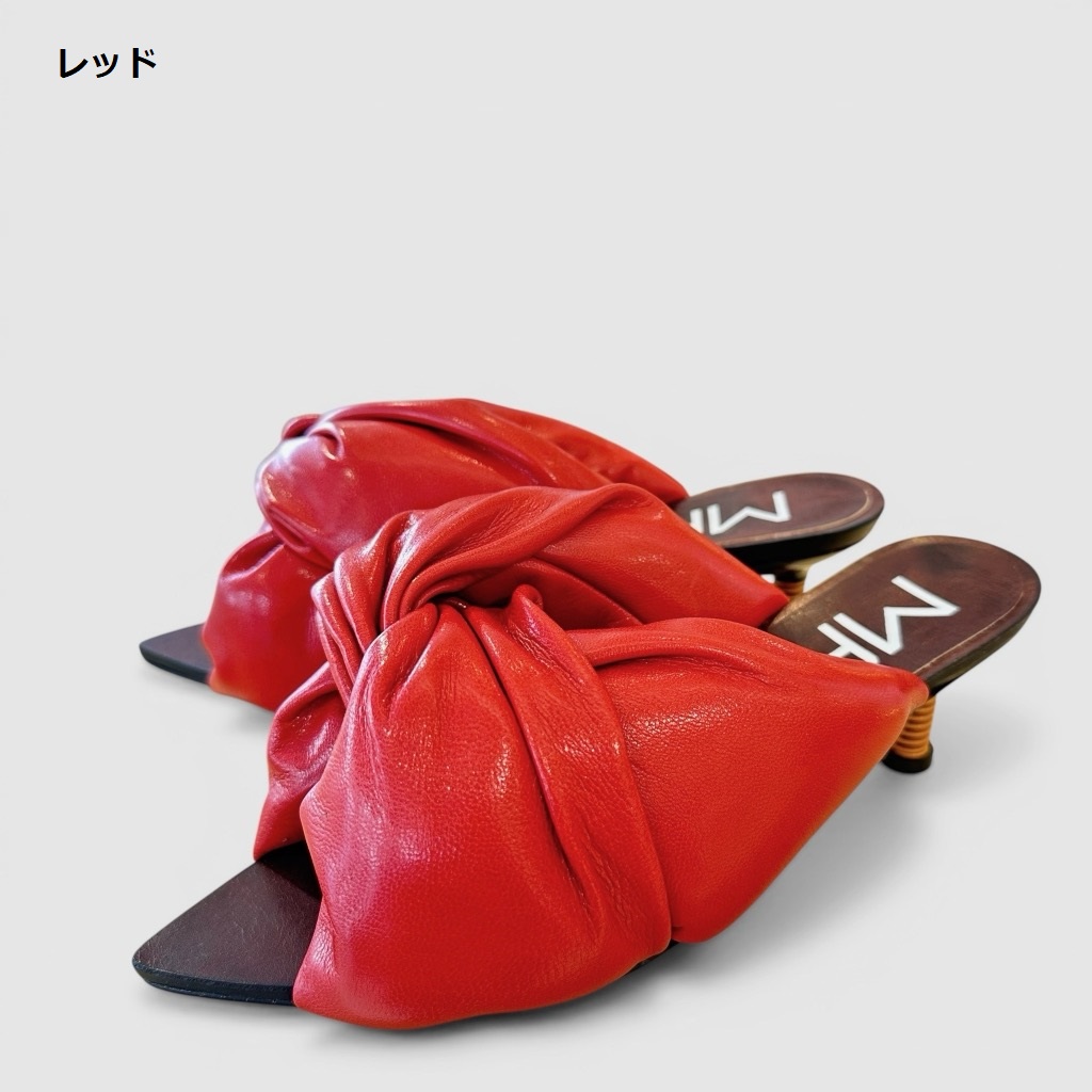 【送料無料】2026春夏新作 MANA マナ ツイスト リボン ミュール サンダル パデット アートヒール レザー 本革 靴 レディース 565002