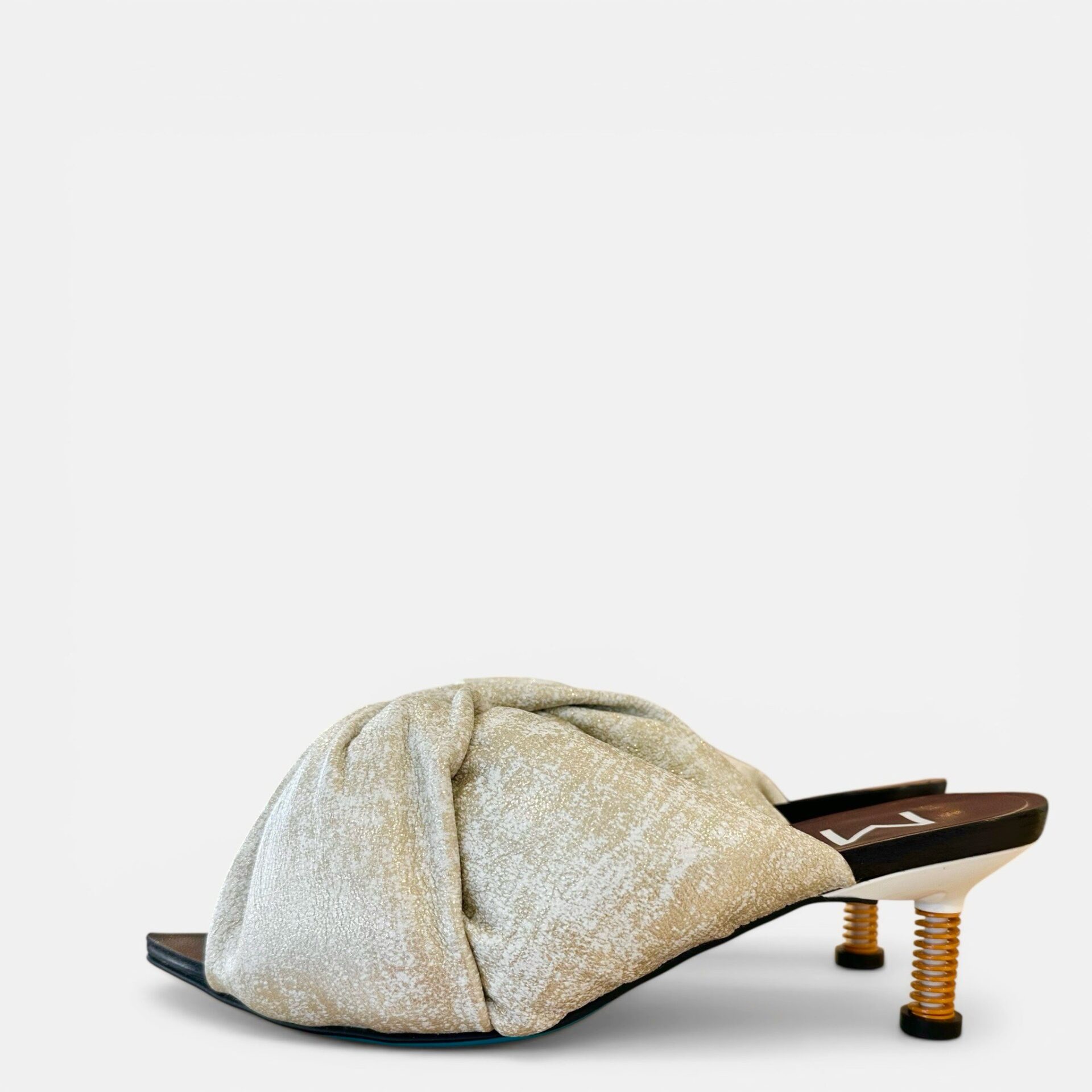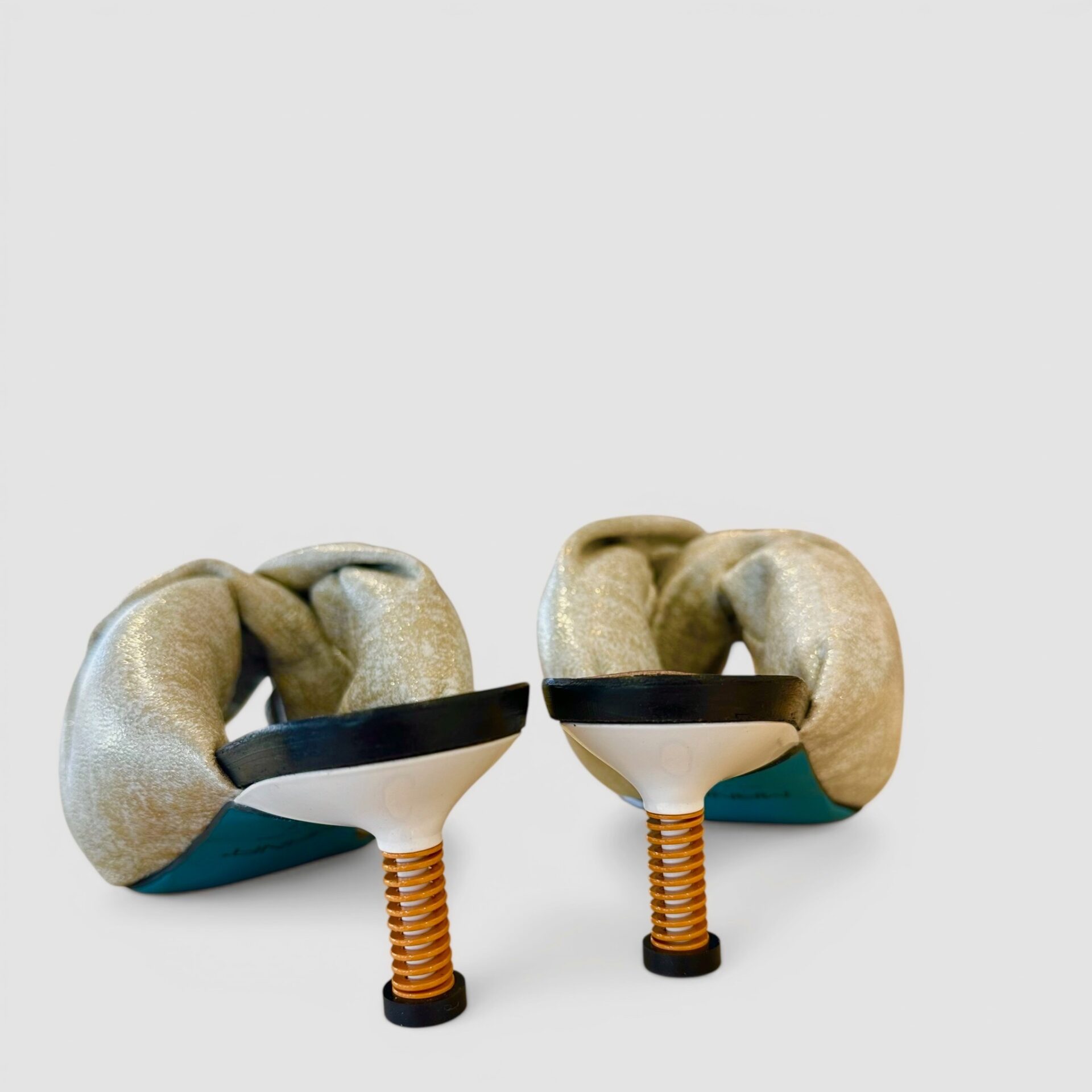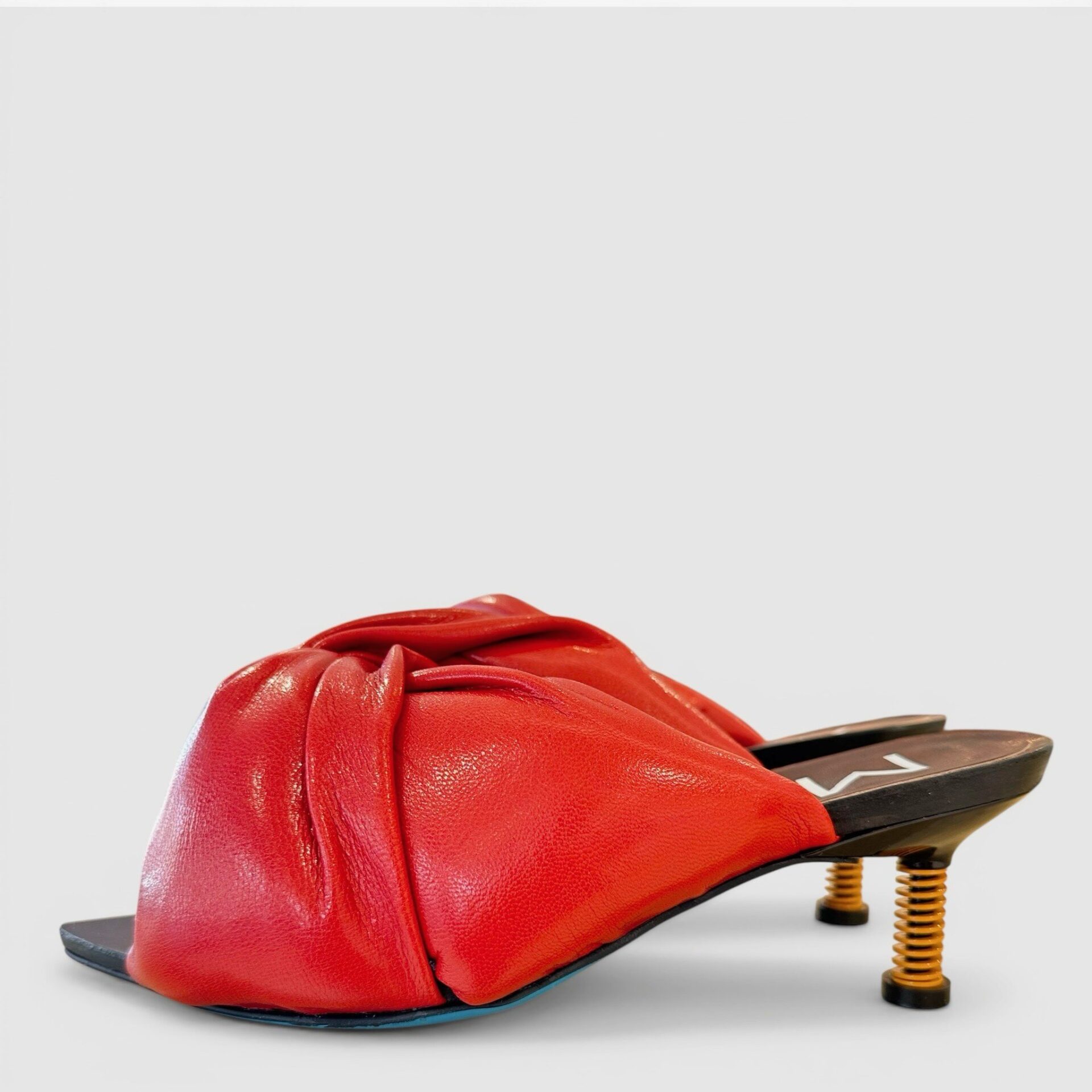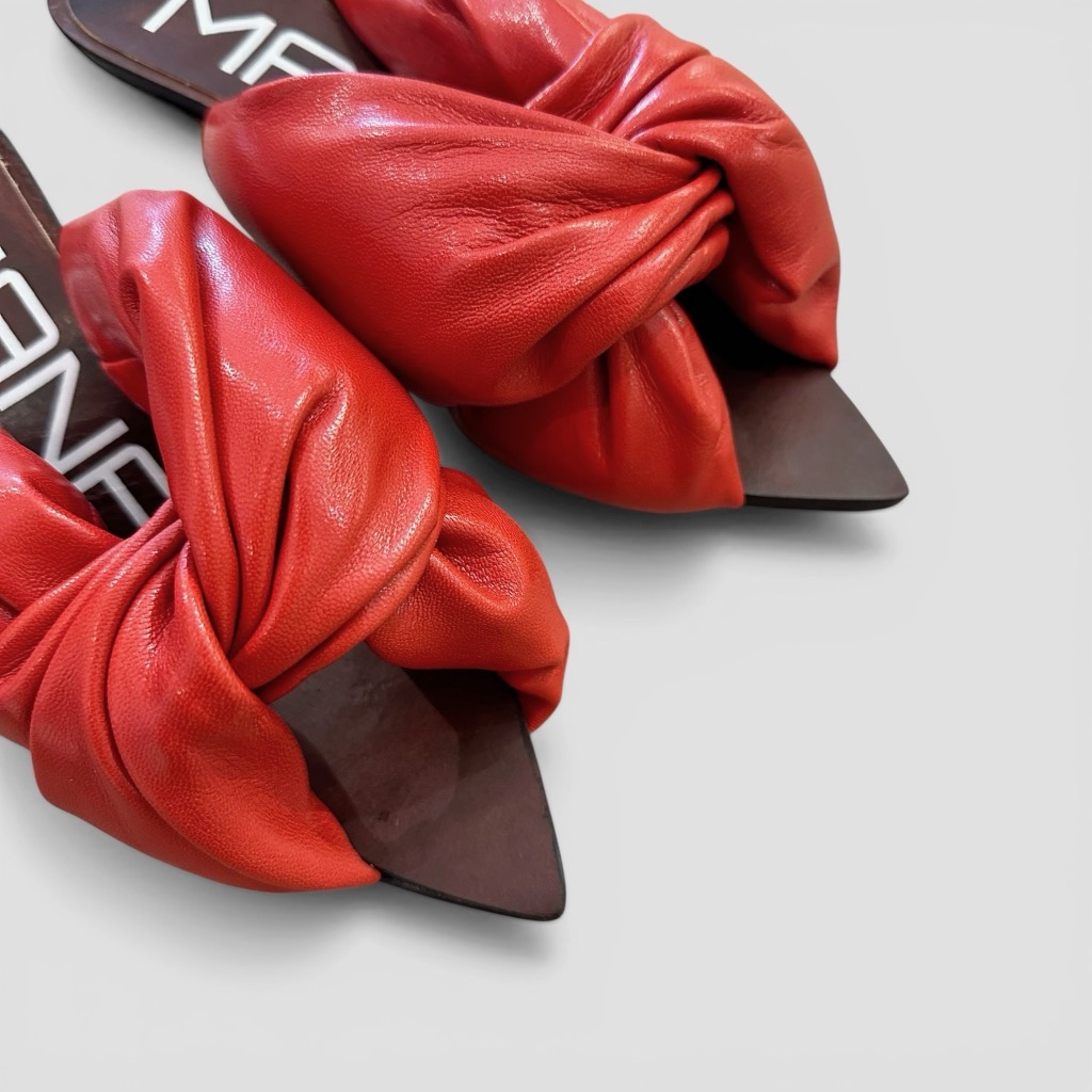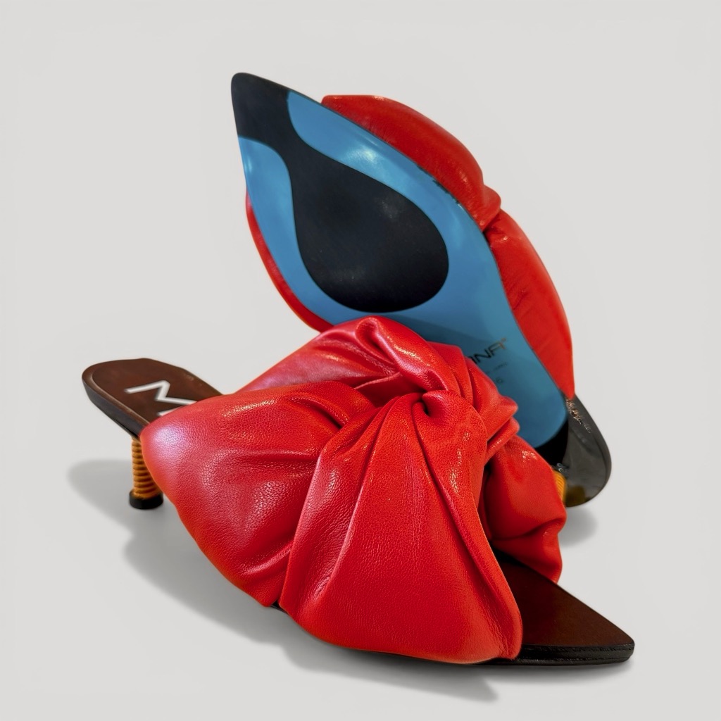 ビッグリボンが印象的なミュールサンダル。アッパーは非常に柔らかい本革ゴートを使用。インソールにはヌメ革を使用。さっと簡単に履け着脱がノンストレスに行えます。パデット(中綿入り)でしっかり足をホールドしパカパカしません。ヒールはスプリングモチーフになっており細く見えますが安定感が良いです。たっぷりのボリューム感がたまらないアクセントになるサンダルです。