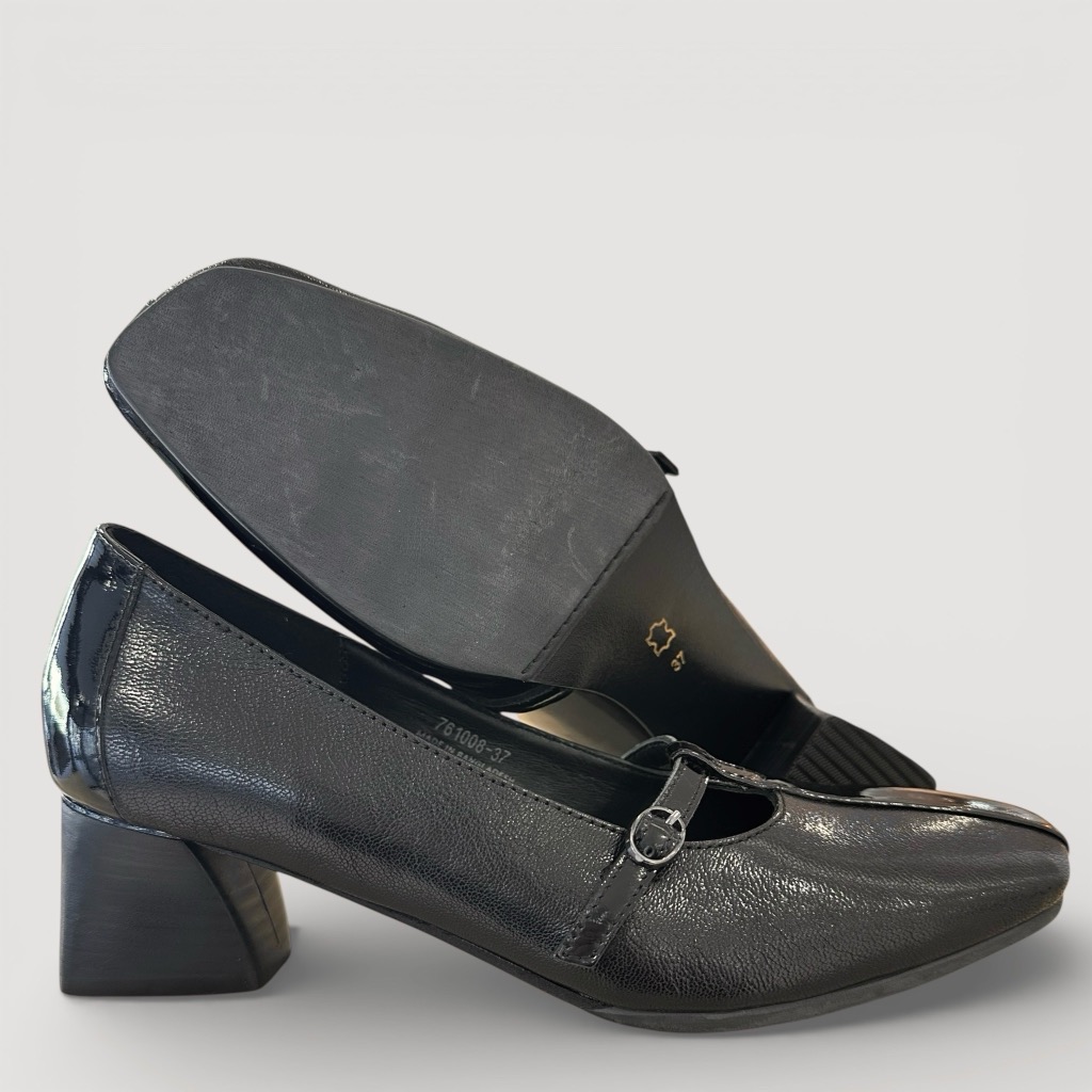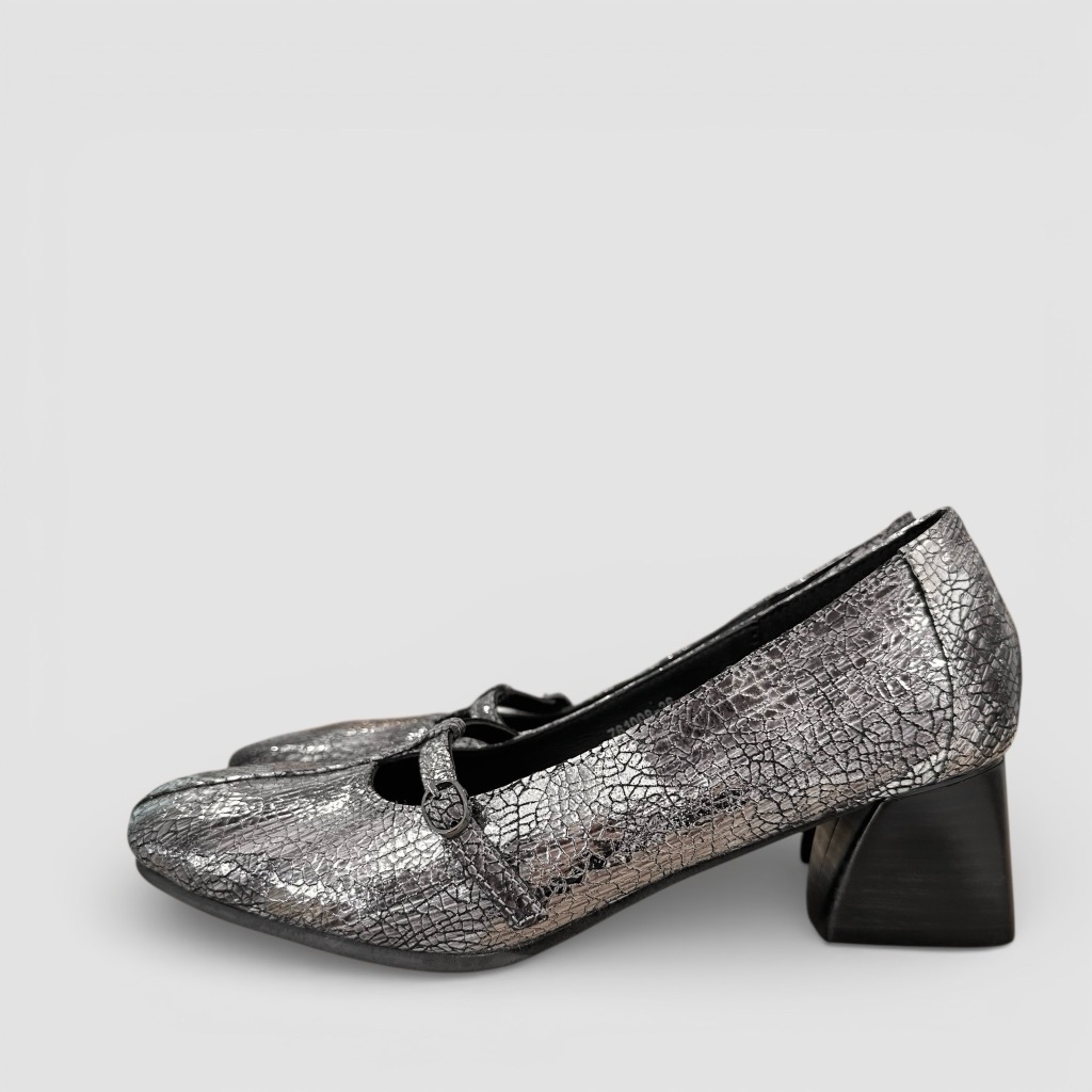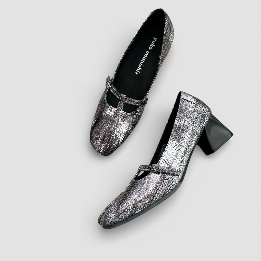 Tストラップになったヒールパンプス。アッパーは柔らかく足馴染み能良い山羊革を使用。ブラックメタリックはクラック(ひび割れ)加工。ブラックはエナメルとスムースのコンビ。インソールには低反発のふわふわのクッションが入っており長時間の使用でも楽ちん。サッと履けるデザインで脱ぎ履き簡単。きちんと感のあるデザインでスーツの足元などにもお使いいただけます。