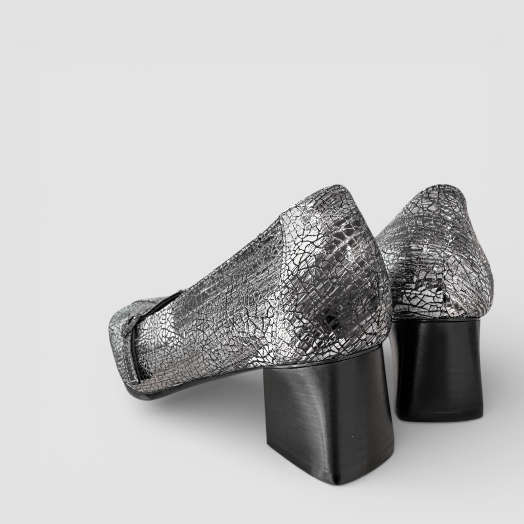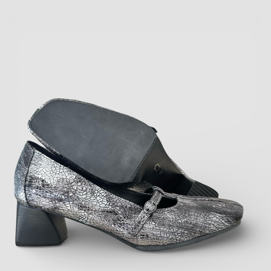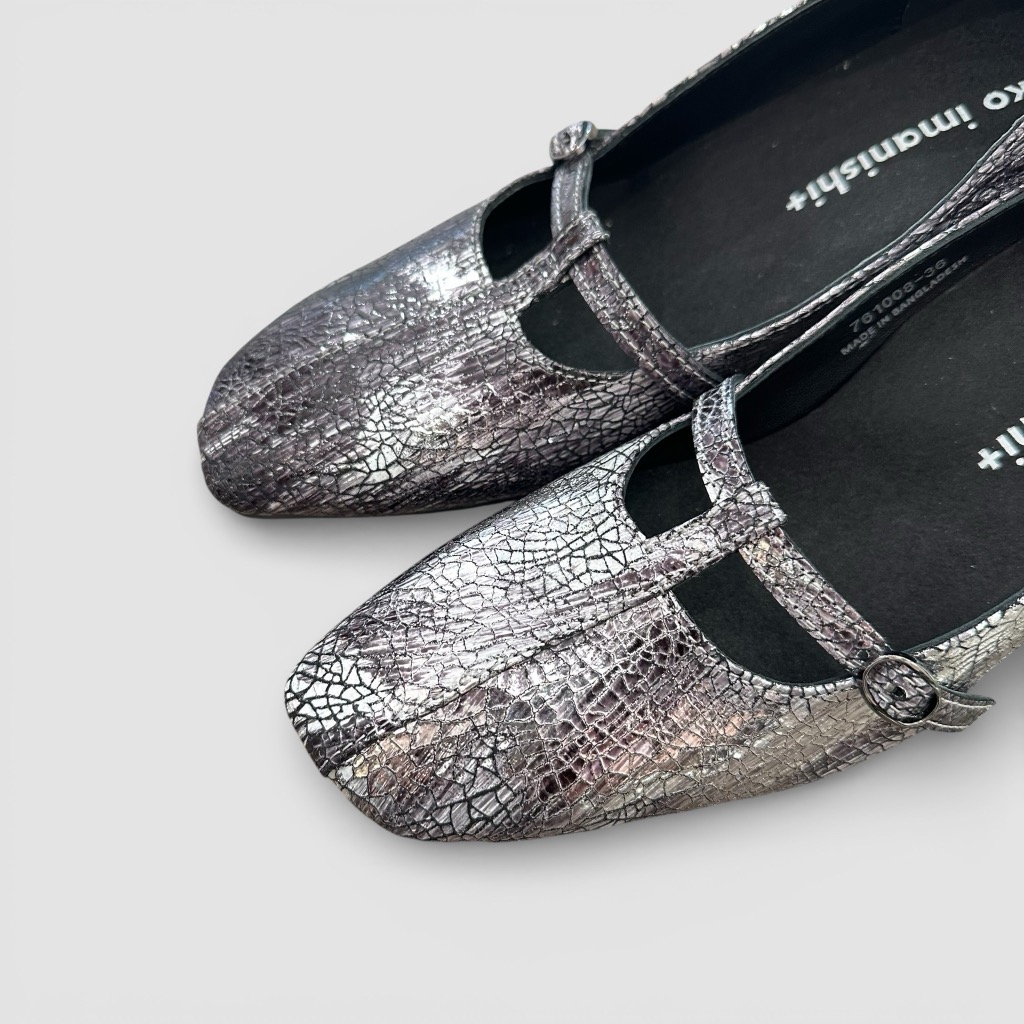 Tストラップになったヒールパンプス。アッパーは柔らかく足馴染み能良い山羊革を使用。ブラックメタリックはクラック(ひび割れ)加工。ブラックはエナメルとスムースのコンビ。インソールには低反発のふわふわのクッションが入っており長時間の使用でも楽ちん。サッと履けるデザインで脱ぎ履き簡単。きちんと感のあるデザインでスーツの足元などにもお使いいただけます。