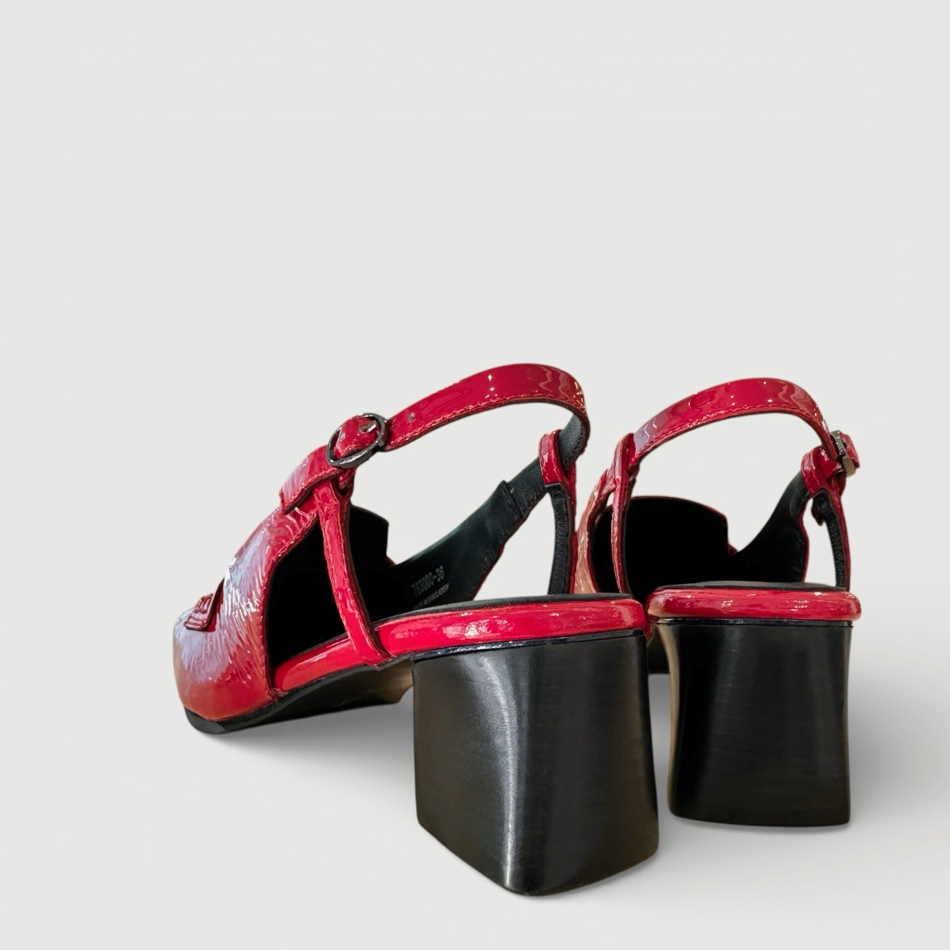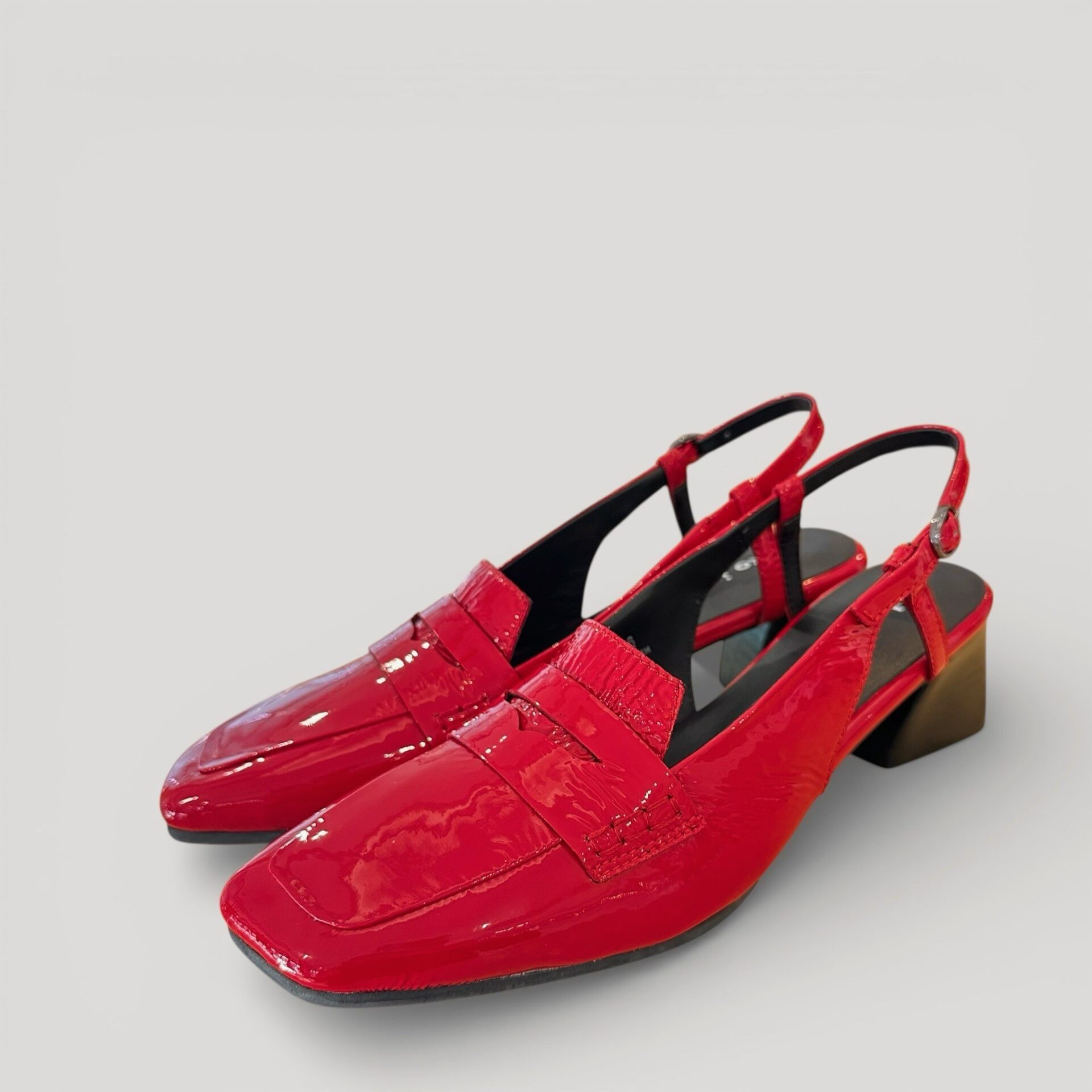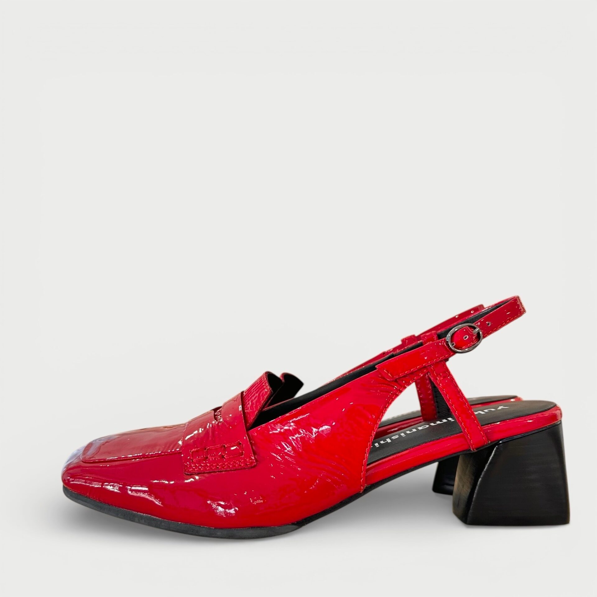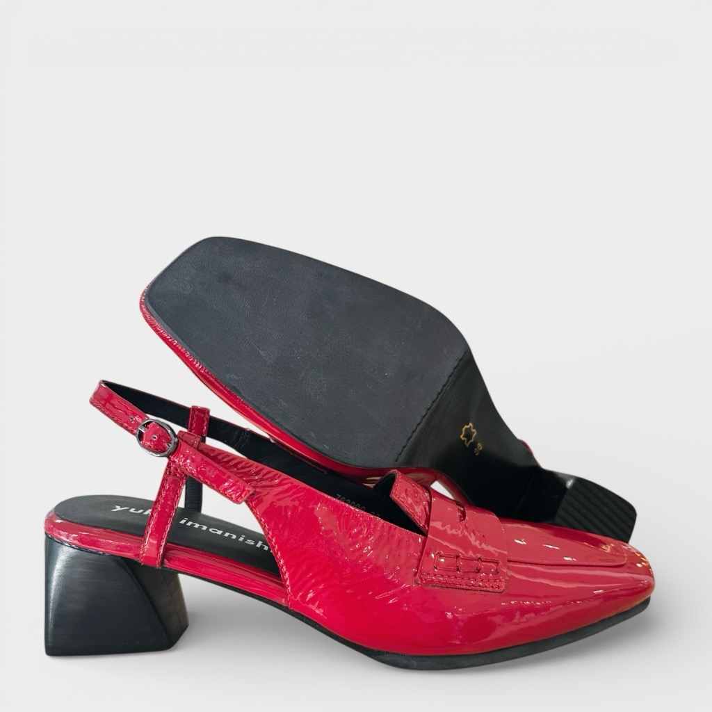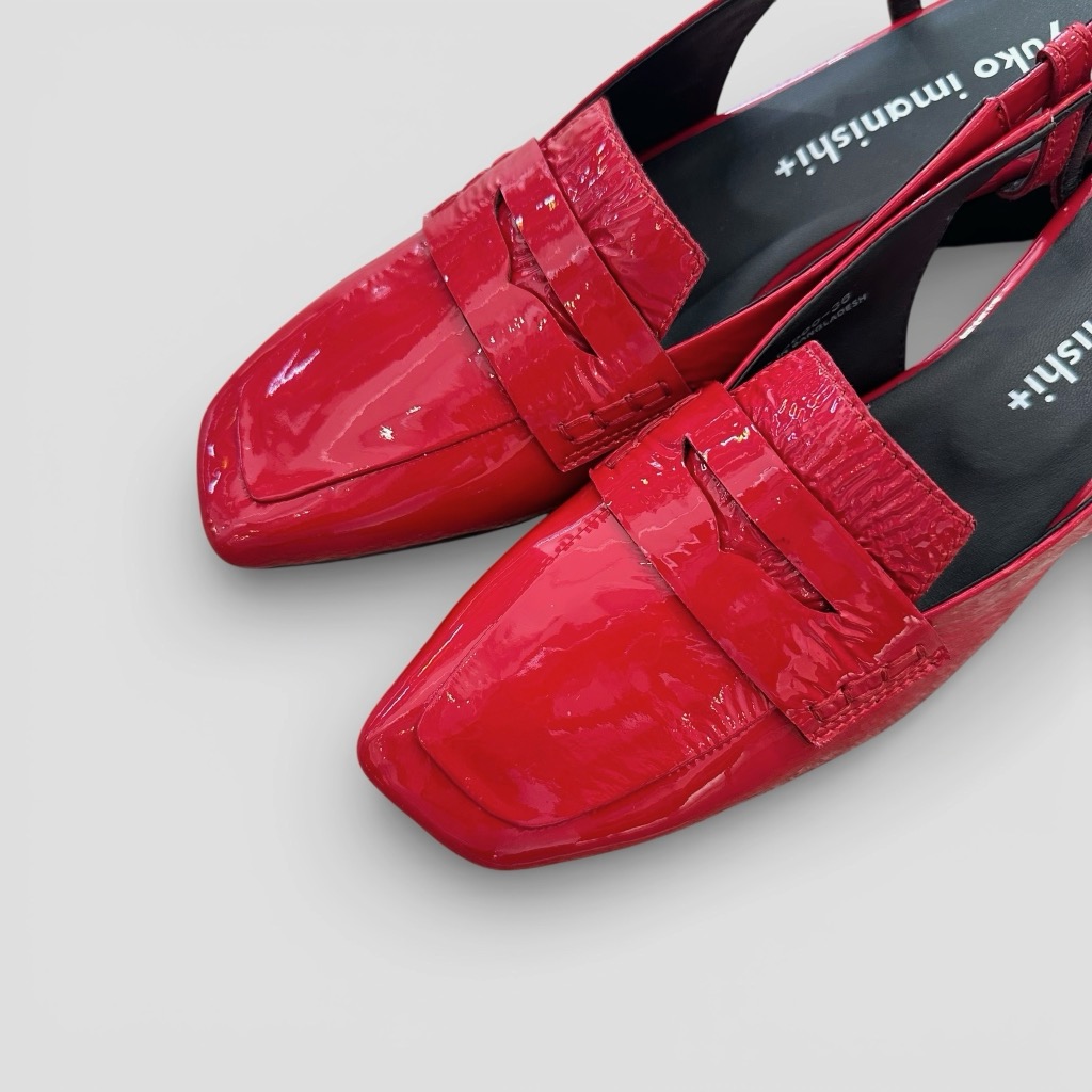バックバンドになったヒールパンプス。アッパーは柔らかく足馴染み能良い本革エナメルを使用。バックバンドをサッと引き上げるだけで履け脱ぎ履き簡単。インソールには低反発のふわふわのクッションが入っており長時間の使用でも楽ちん。メンズライクなデザインを赤いエナメルがエレガントに昇華させます。