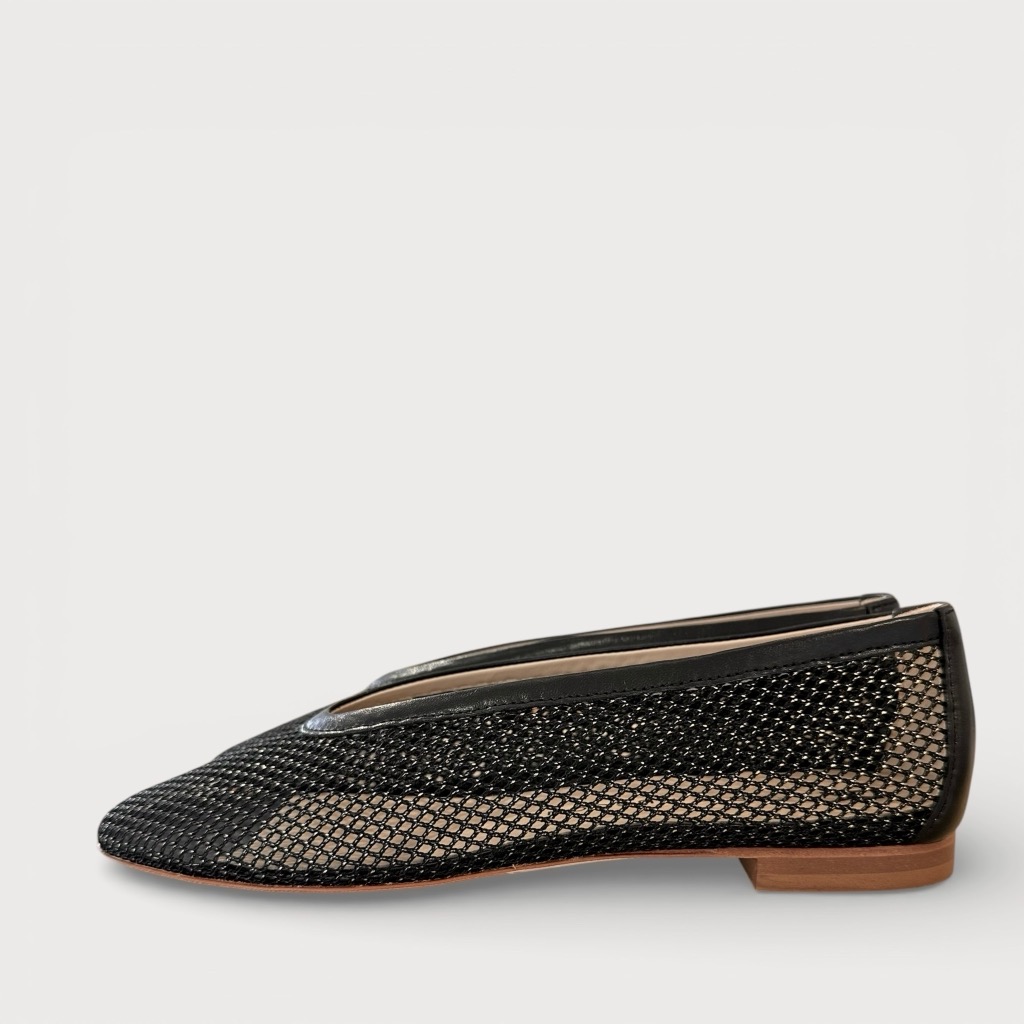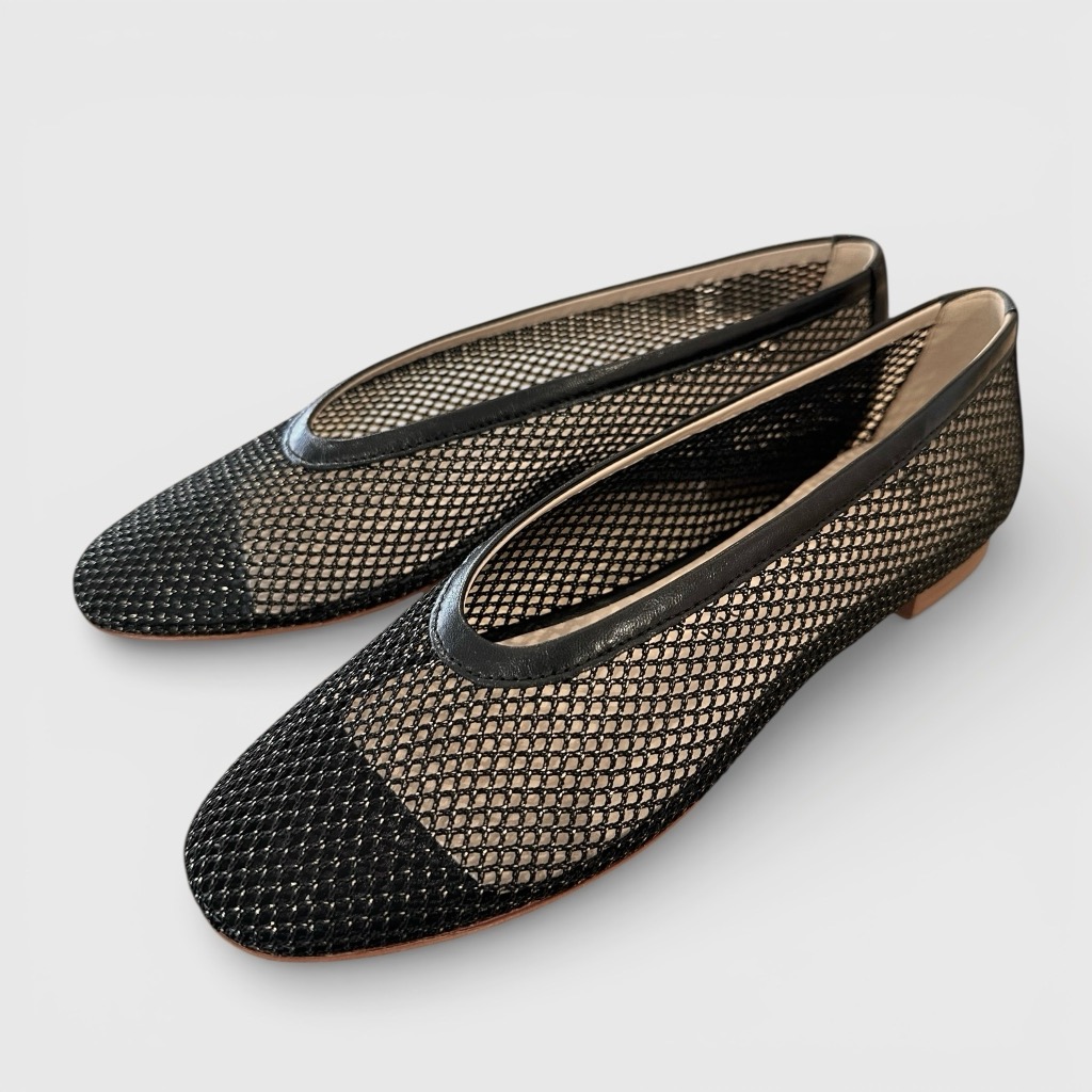 シンプルなバレエシューズ。アッパーはラメの入ったメッシュ素材を使用。涼やかな印象で華やかさもあります。アウトソールは革底仕様。サッと脱ぎ履きできますがきちっと感もありエレガントなたたずまいです。
