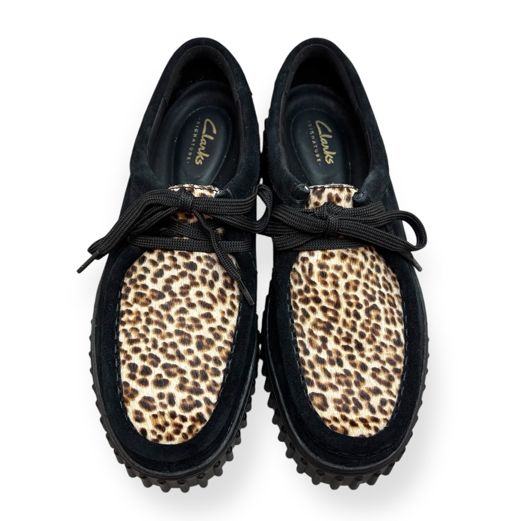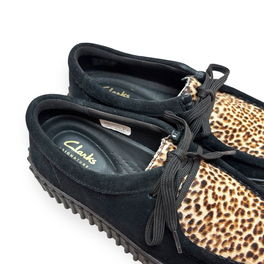 名作ワラビーからインスパイアされたトーヒル。アッパーはレオパードプリントした本革ヘアとスエードのコンビ。ワラビーのアッパーにチャンキーソールを組み合わせた新鮮で個性的なデザインのシューズ。インソールは取り外し可能なカップインソール。目を引くリブのTPRアウトソールは軽量でありながら久性もあり快適な履き心地。靴裏の大きなClarksのロゴにも注目。クッション性や軽量性プレミアム感を体現した一足。地球環境に配慮した材料を採用しています。