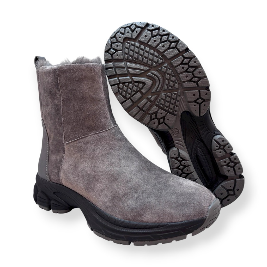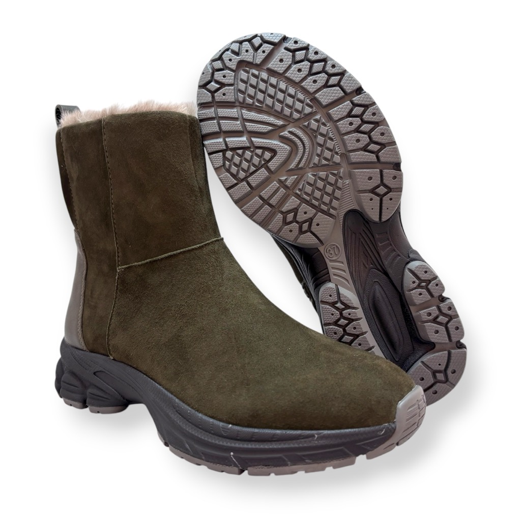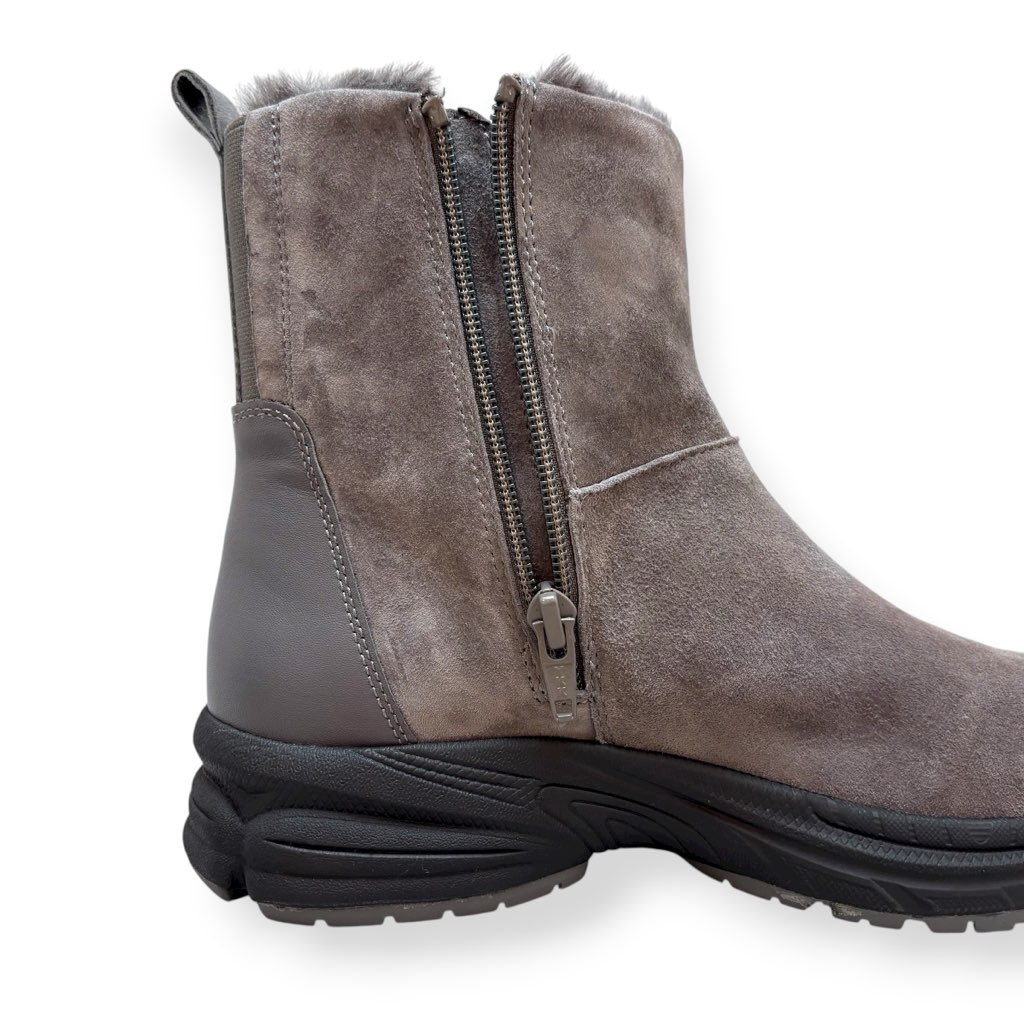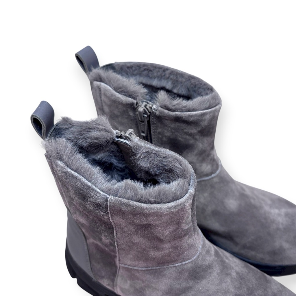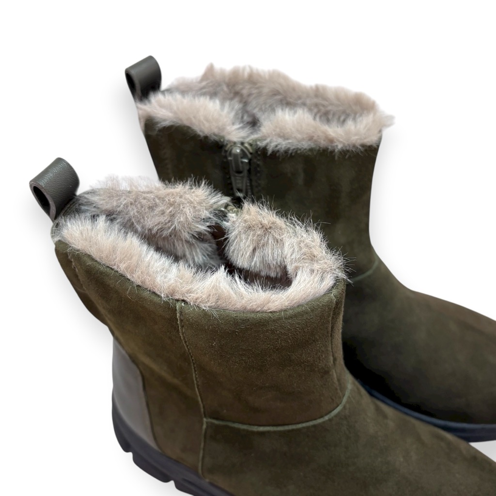 ファーライニングで温かく雨でも履けるジップアップのショートブーツ。アッパーは柔らかい起毛素材の牛革と羊革のコンビ。撥水加工してあり少々の雨降りでもお使いいただけます。内側ファスナーで脱ぎ履き簡単。インソールには取り外しできるカップインソールを採用。お好みのインソールと取り換えも可能。ソールはグリップがよく効き滑りにくくクッション性に優れたスポーツソール仕様。軽量でノンストレスの履き心地。おしゃれも犠牲にしない暖かく実用性に富んだブーツです。