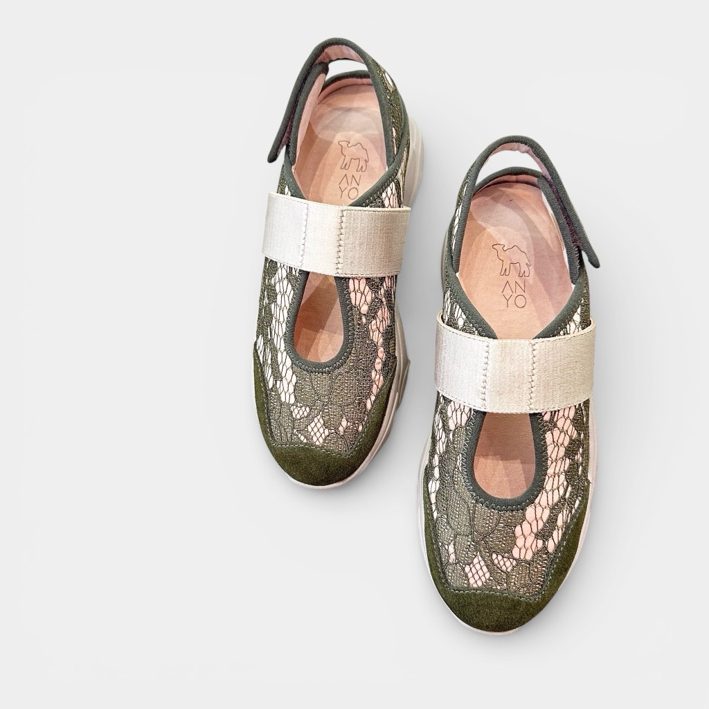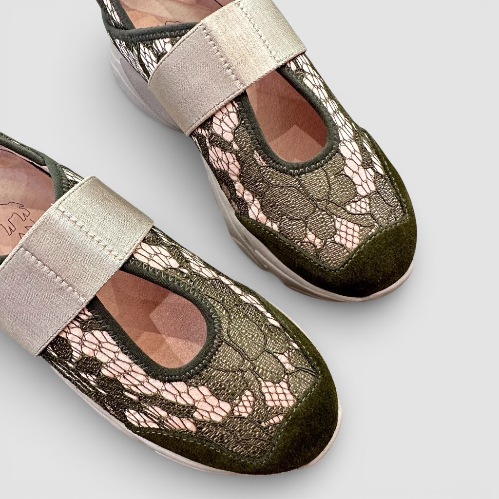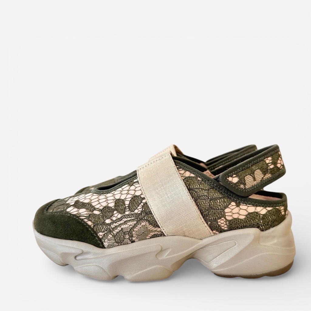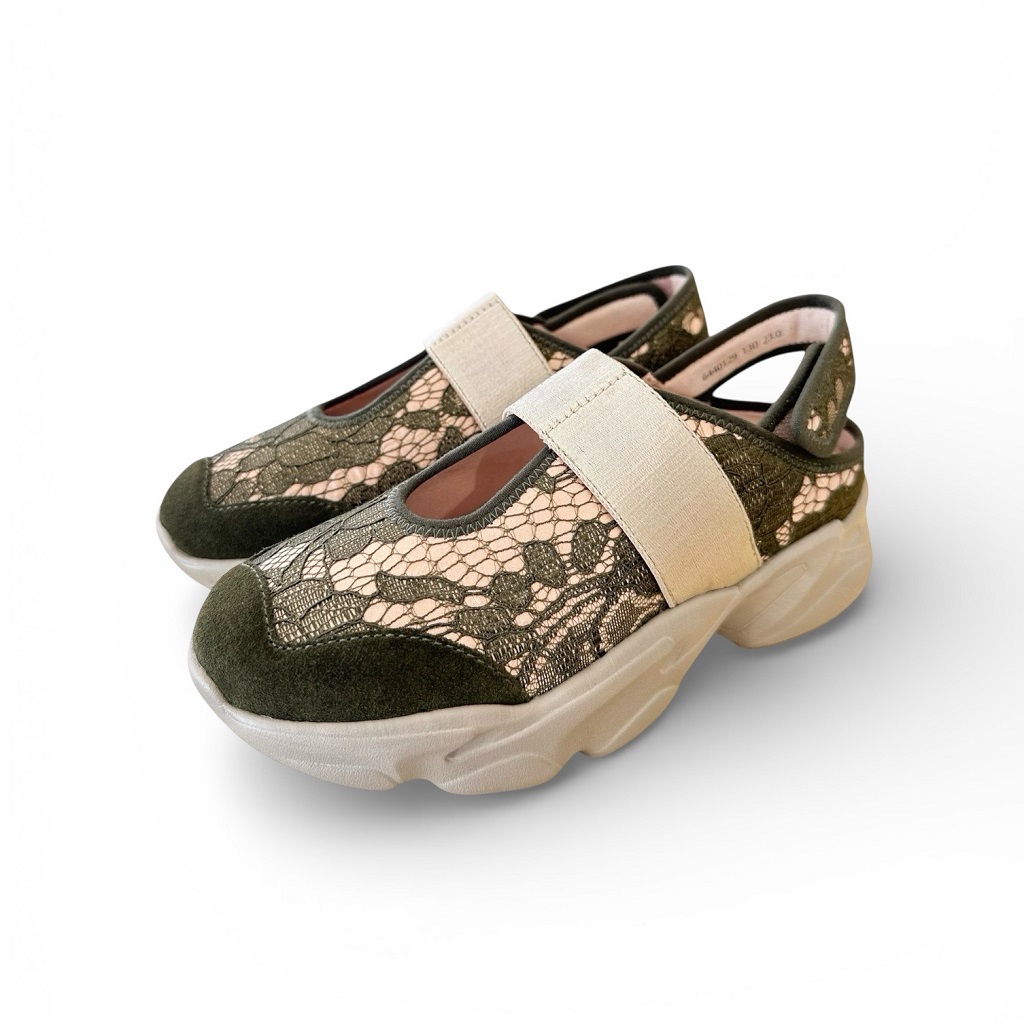 厚底バックレススニーカー。アッパーはナイロンサテンに繊細なレースを貼り合わせた素材。バックバンドはマジックテープでアジャスト可能。甲ベルトはゴム入りで足に優しくしっかりフィット。インソールには取り外しできるカップインソールを採用。お好みのインソールと取り換えも可能。厚底になったソールは滑りにくくクッション性に優れます。スポーティーな中にもシックな表情のある一足です。