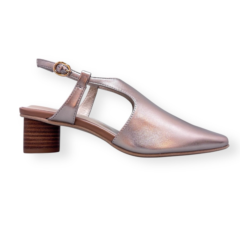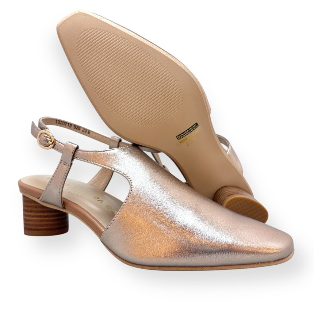 バックストラップになった甲深デザインのパンプス。アッパーは非常に柔らかく足馴染みの良い羊革を使用。インソールはクッション入り。足を入れサッと引き上げるだけで脱ぎ履き簡単です。チャンキーヒールで安定感抜群。ブライダルゲストなどセレモニーやパーティーシーンでも活躍。甲深デザインのためパンプスだとパカパカしやすい方にも安心の履き心地です。普段使いでデニムなどカジュアルな装いにも対応します。