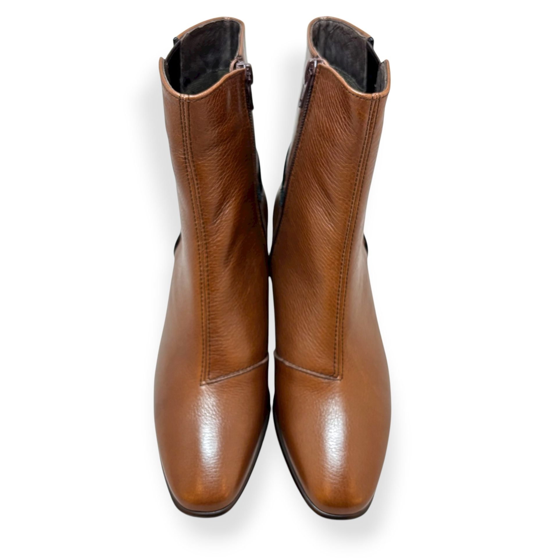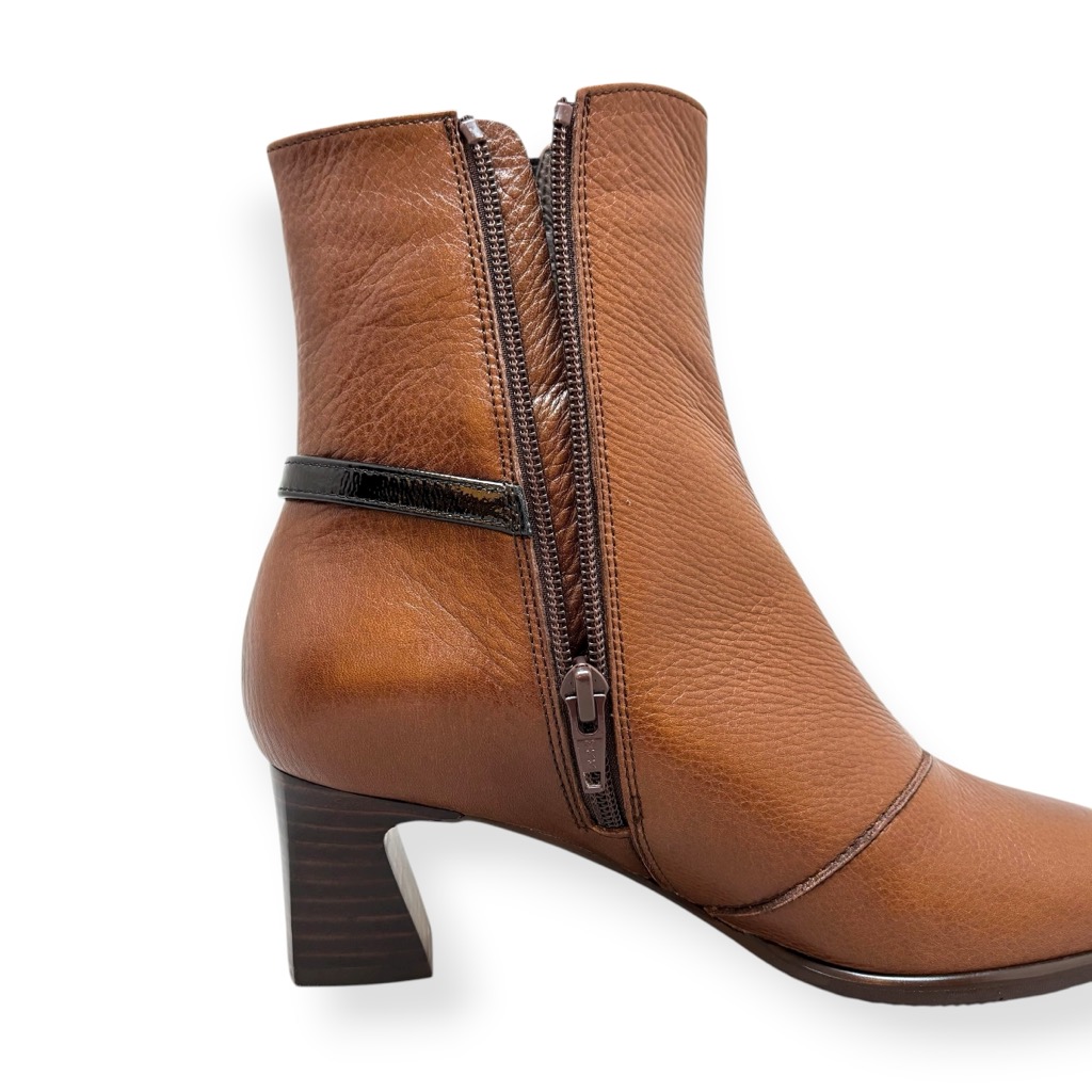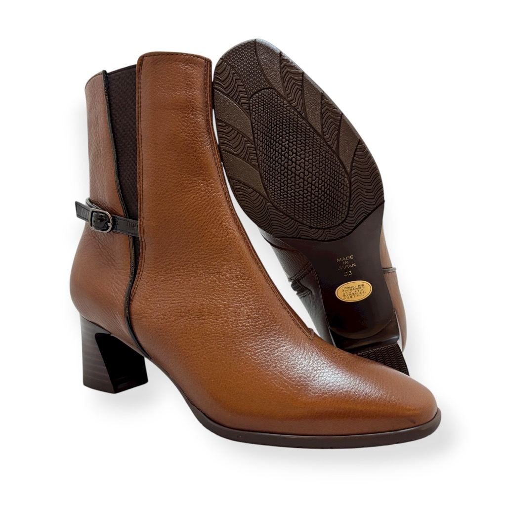 内側ファスナーのショートブーツ。アッパーは柔らかく足馴染みの良い牛革を使用。インソールにはクッション入り。ジッパー付きで脱ぎ履きしやすいです。ソールは屈曲性に優れ地面をしっかりとらえます。足首部分の飾りベルトがシルエットを引き締め美脚効果抜群。程よいヒールの高さできちっと感のあるデザイン。少し背伸びしてお出かけしたい日にもどうぞ。