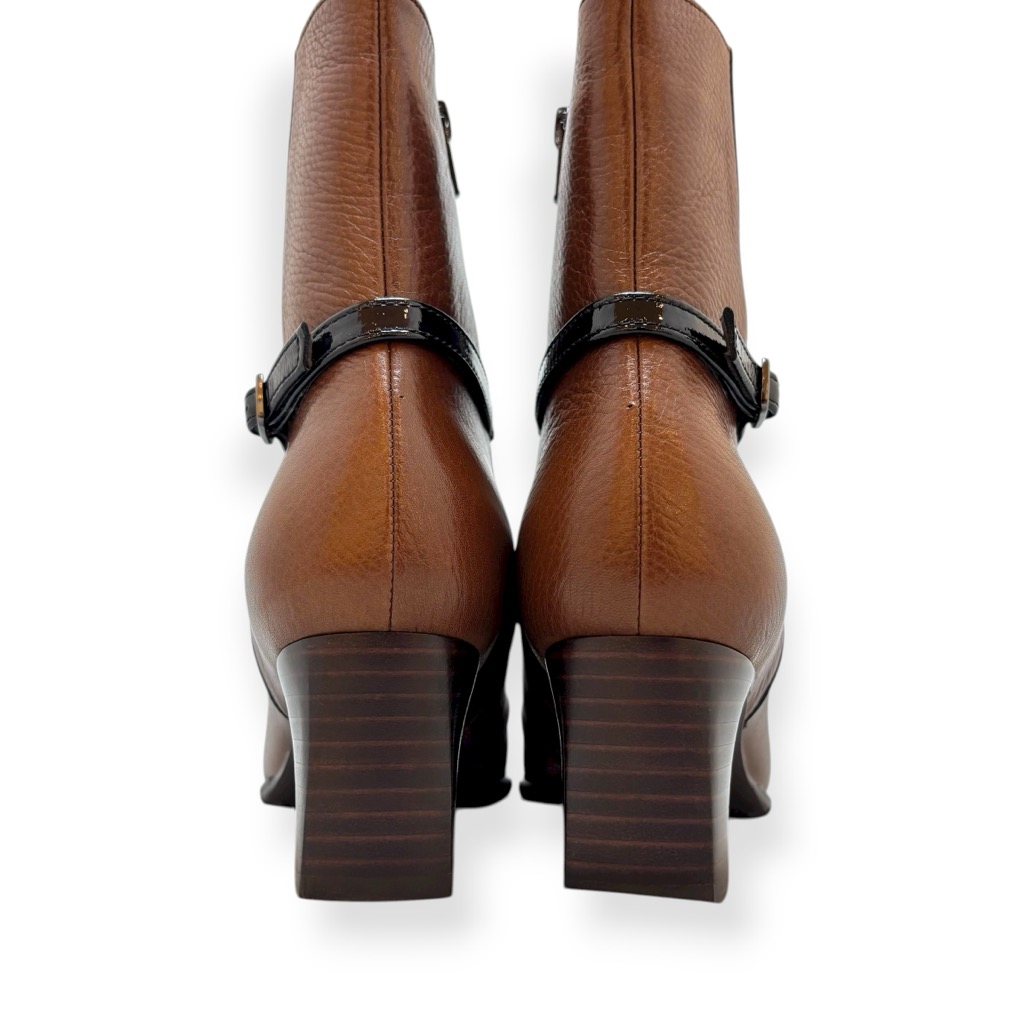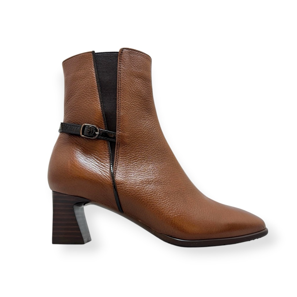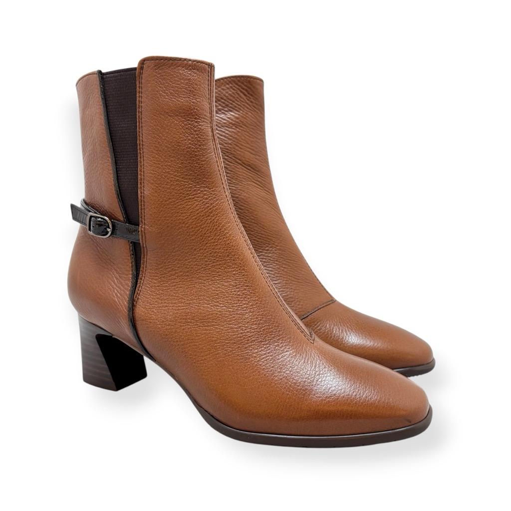 内側ファスナーのショートブーツ。アッパーは柔らかく足馴染みの良い牛革を使用。インソールにはクッション入り。ジッパー付きで脱ぎ履きしやすいです。ソールは屈曲性に優れ地面をしっかりとらえます。足首部分の飾りベルトがシルエットを引き締め美脚効果抜群。程よいヒールの高さできちっと感のあるデザイン。少し背伸びしてお出かけしたい日にもどうぞ。